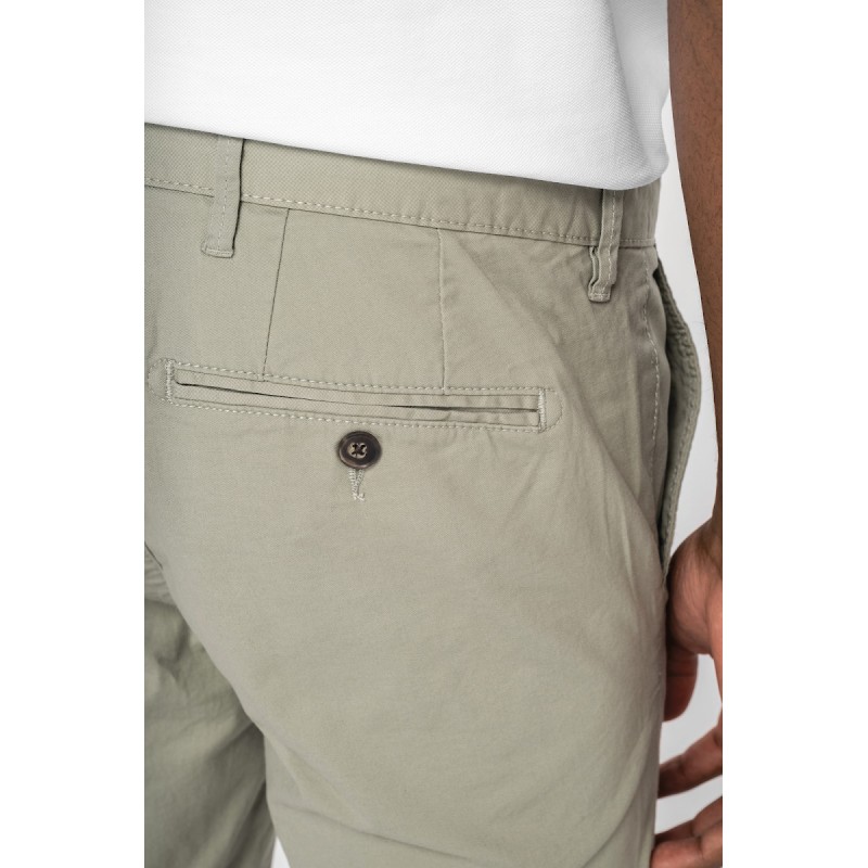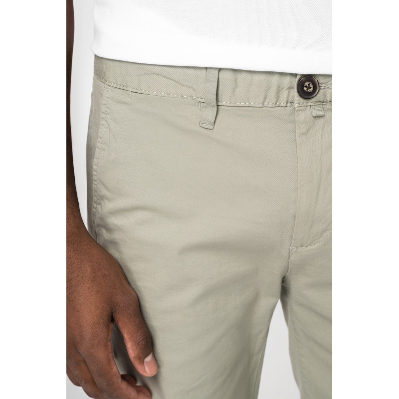 98% coton biologique / 2 % élasthanne. Coton twill. Coupe ajustée. Lavé aux enzymes. Finition peau de pêche. Ceinture avec passants et passe ardillon. Braguette avec boutons en plastique recyclé et zip en métal. Deux poches devant et une poche monnaie dans sac de poche droit au porté. Deux poches passepoilées au dos avec coins renforcés et boutons en plastique recyclé. Intérieur fond de poches devant et dos imprimés avec des micros motifs contrastés. Piqûre nervure fourche devant et dos pour renfort. Vêtement lavé après montage : les couleurs peuvent varier d’un produit à un autre.