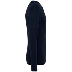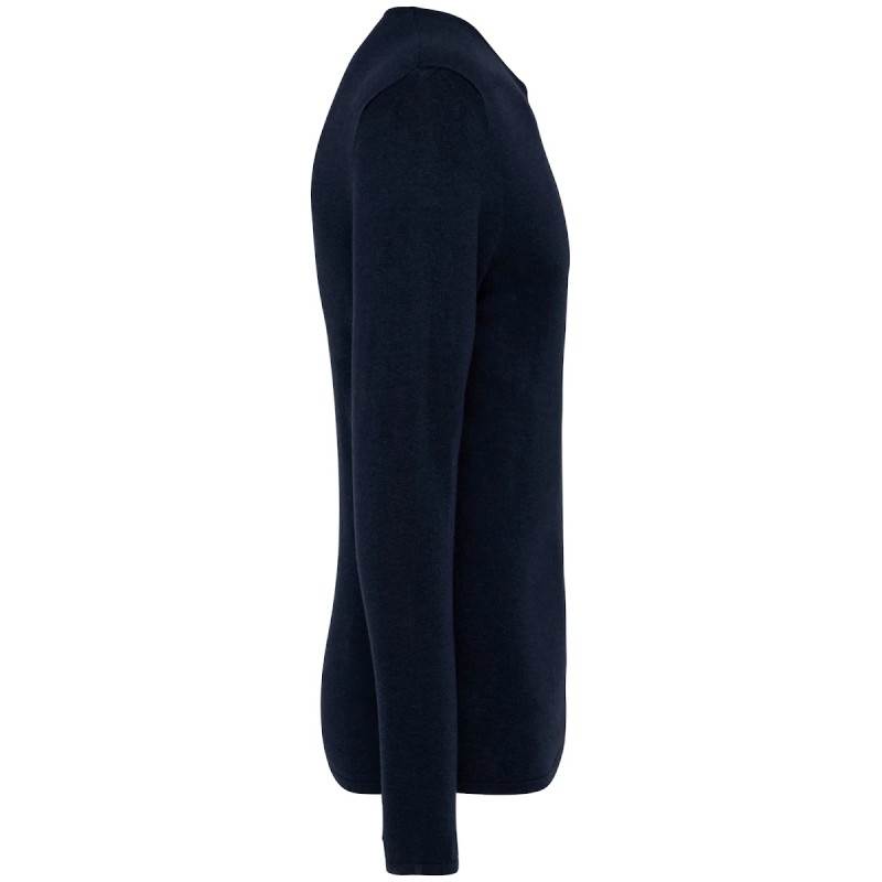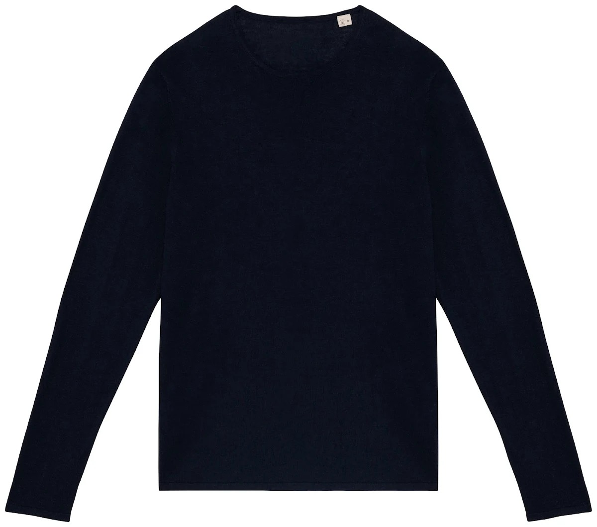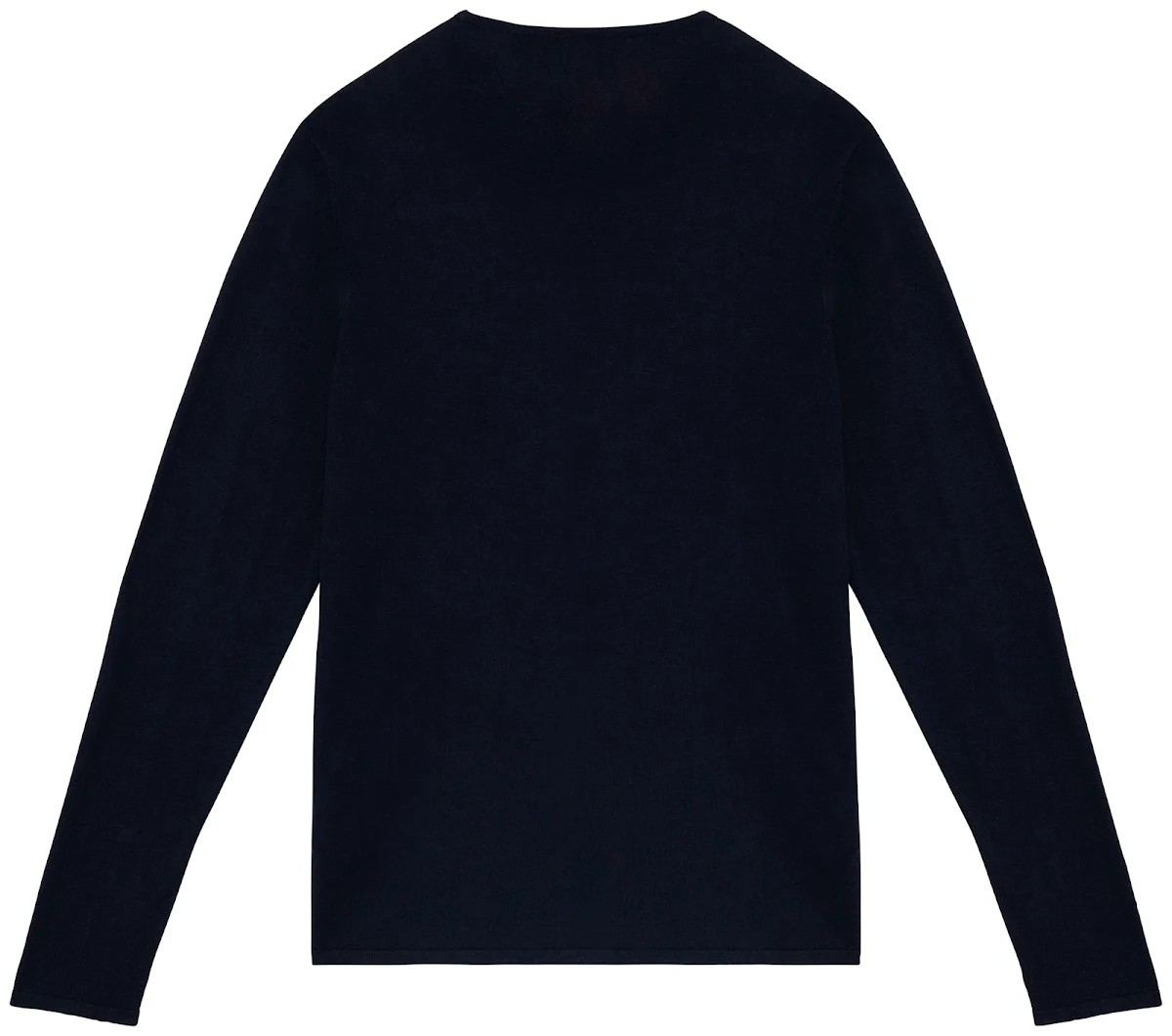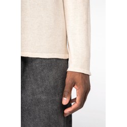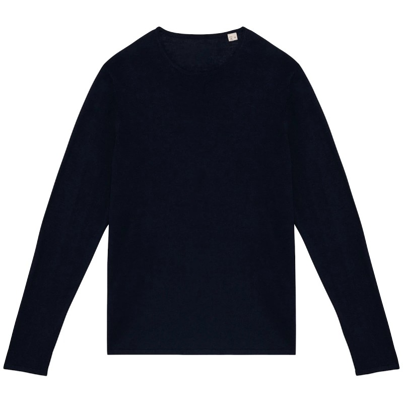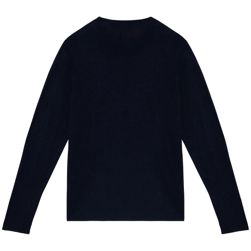 50% coton biologique / 50% Lyocell TENCEL™*. Coton peigné. Jauge 14. Coupe ajustée. Bord côte col tubulaire 1 x 1 en matière principale. Finition tubulaire en matière principale bas de manches et de vêtement. Tricoté en « Fully Fashion ». Poids moyen en taille L : 200 g. *TENCEL™ est une marque de Lenzing AG.