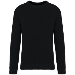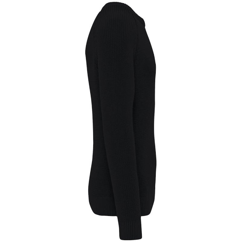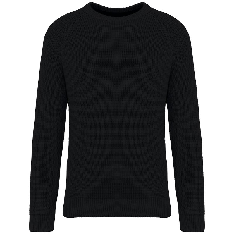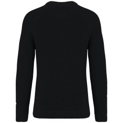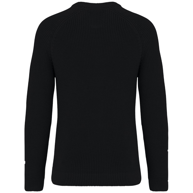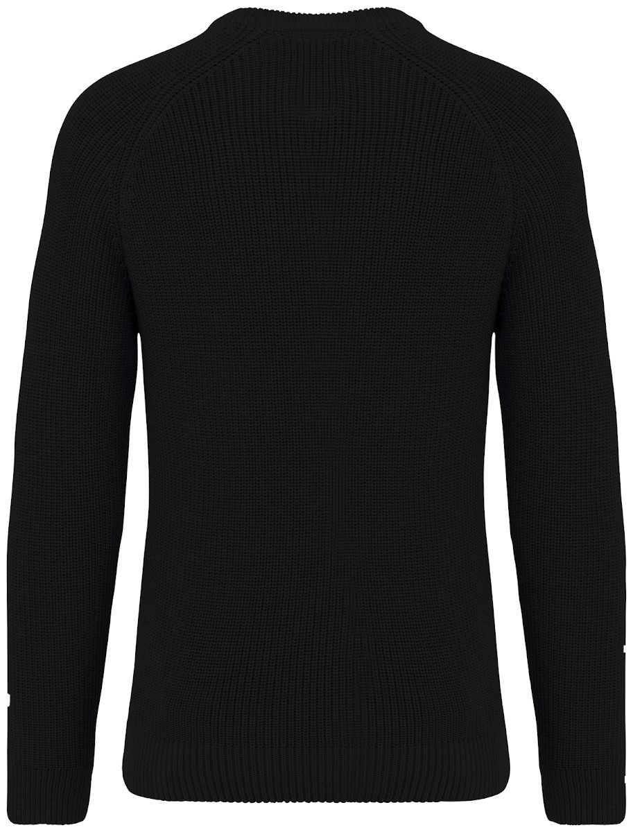 50% coton biologique / 50% polyester recyclé post-consumer. Jauge 5. Coupe ajustée. Patch de personnalisation intérieur col. Bande de propreté en chevrons constratée Navy Blue sur tous les coloris. Manches raglan. Entièrement tricoté en côte 1 x 1 et montage « Fully Fashion ». Poids moyen en taille L : 850 g.
