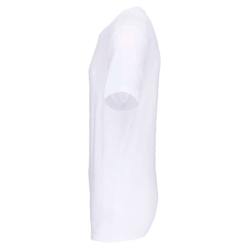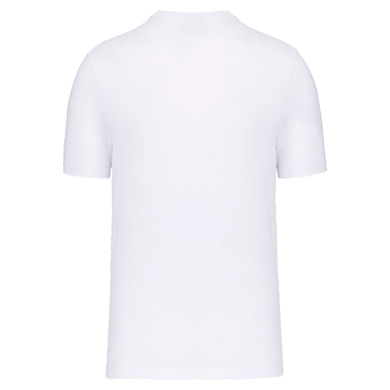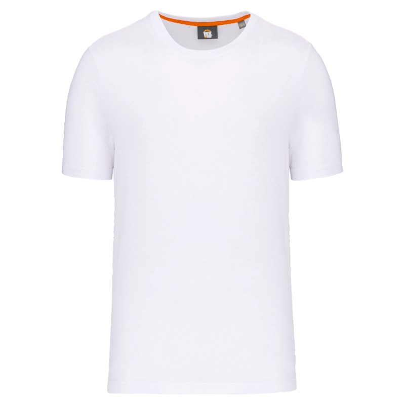 Coloris unis : 60% coton biologique / 40% polyester recyclé. Coloris Oxford Grey : 90% coton biologique / 10% viscose. Tissu doux, lavage aux enzymes. Lavable à 60°C. Coupe droite. Encolure ronde avec bord-côte 1x1. Bande de propreté chevron contrastée orange dans l'encolure (prolongement dos-épaule sauf pour le coloris blanc). Couture renforcée aux épaules. Etiquette de marque Tear Away pour faciliter la personnalisation.