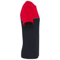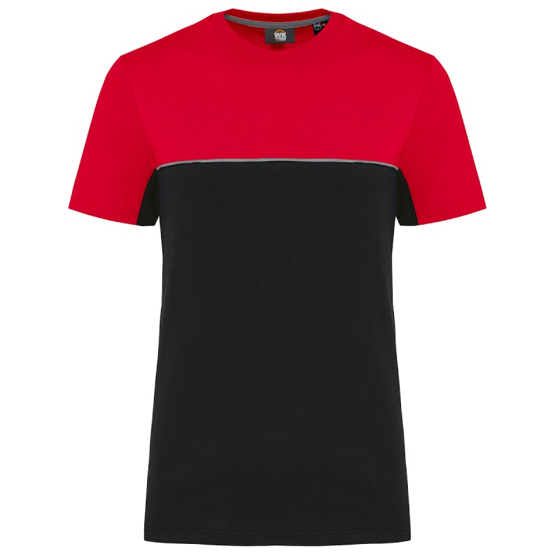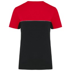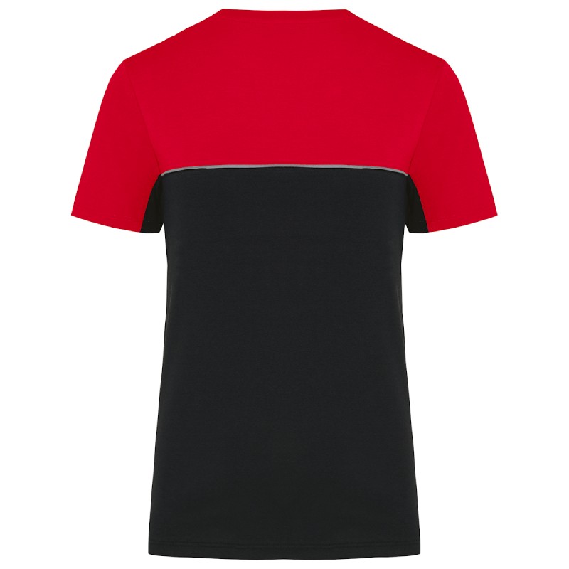 60% coton / 40% polyester recyclé. Coton peigné. Fil Vortex. Maille jersey. Traitement antiboulochage. Lavable à 60°C. Coupe ajustée. Encolure ronde en bord-côte 1x1 avec élasthanne et bande de propreté contrastée en chevron. Passepoil contrasté entre les parties bicolores du vêtement (corps, devant et dos). Finition double aiguille au bas de manches et de vêtement. Etiquette de marque Tear Away.
