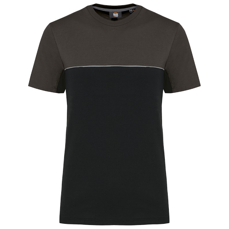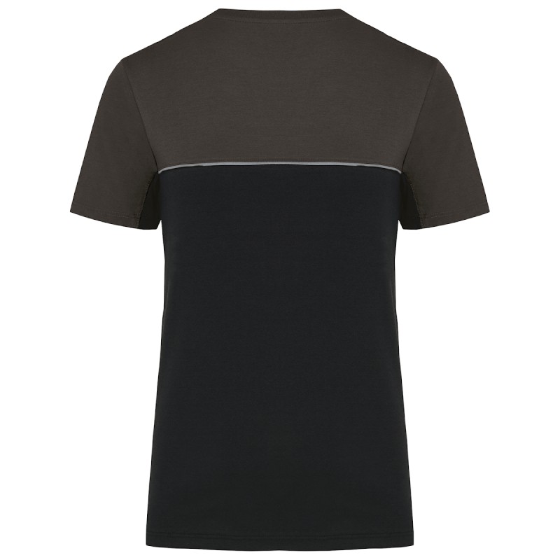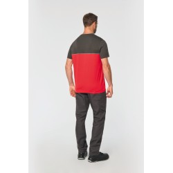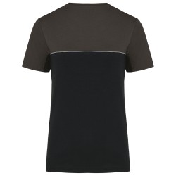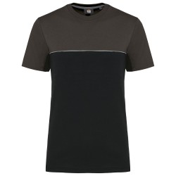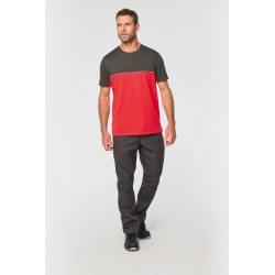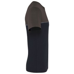 60% coton / 40% polyester recyclé. Coton peigné. Fil Vortex. Maille jersey. Traitement antiboulochage. Lavable à 60°C. Coupe ajustée. Encolure ronde en bord-côte 1x1 avec élasthanne et bande de propreté contrastée en chevron. Passepoil contrasté entre les parties bicolores du vêtement (corps, devant et dos). Finition double aiguille au bas de manches et de vêtement. Etiquette de marque Tear Away.