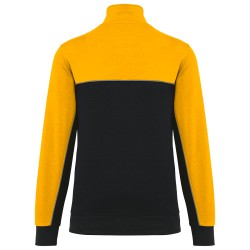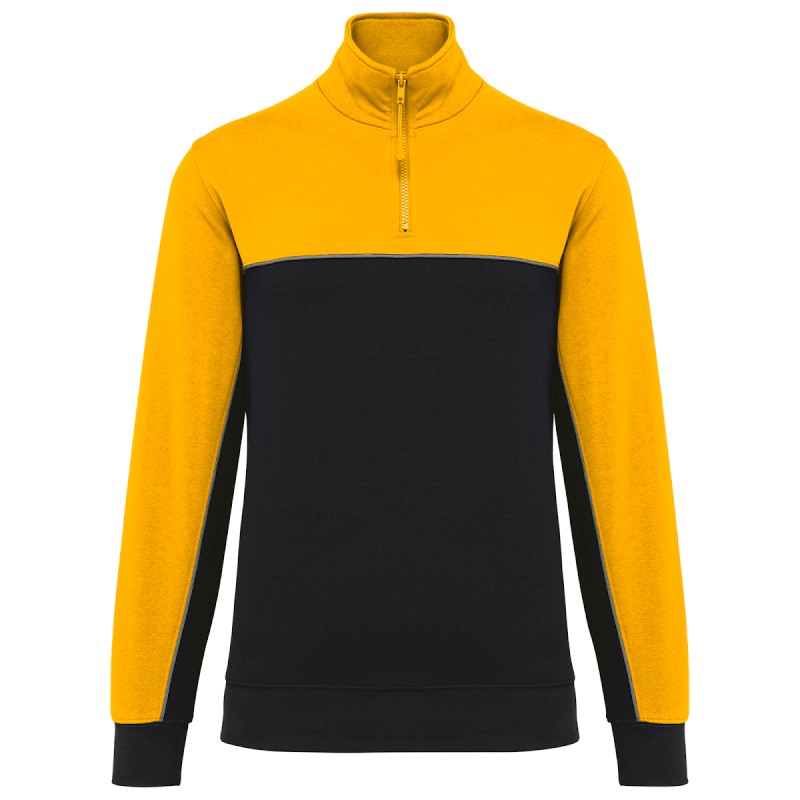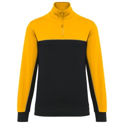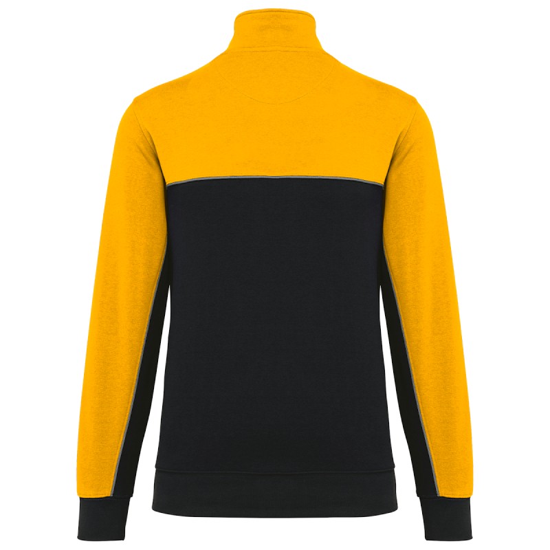 60% coton biologique / 40% polyester recyclé. Molleton gratté 3 fils LSF (Low Shrinkage Fleece). Coupe ajustée. Manches montées. Col avec zip plastique et tire-zip ton sur ton recyclé. Bande de propreté contrastée en chevron. Finition demi-lune encolure dos pour faciliter la personnalisation de marque à l'intérieur. Passepoil contrasté entre les parties du vêtement bicolores (corps et manches devant et dos). Bord-côte 1x1 au bas de manche et de vêtement. Porte-stylo élastiqué 3 compartiments sur la manche gauche au porter. Etiquette de marque Tear Away.