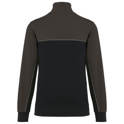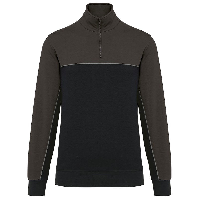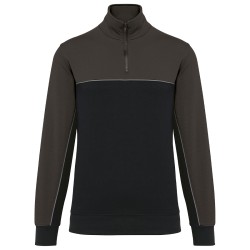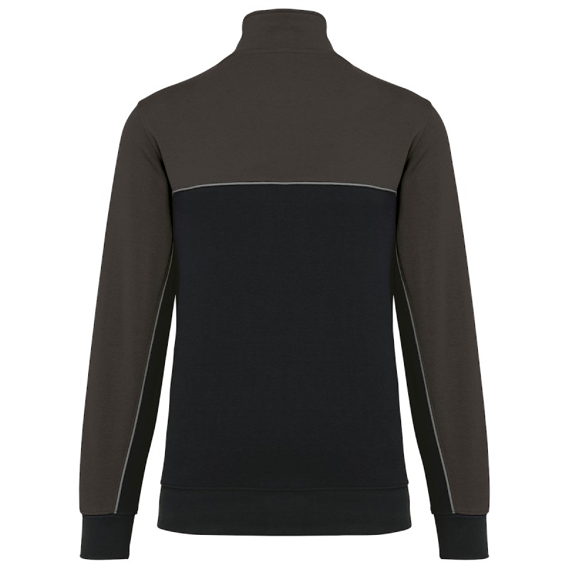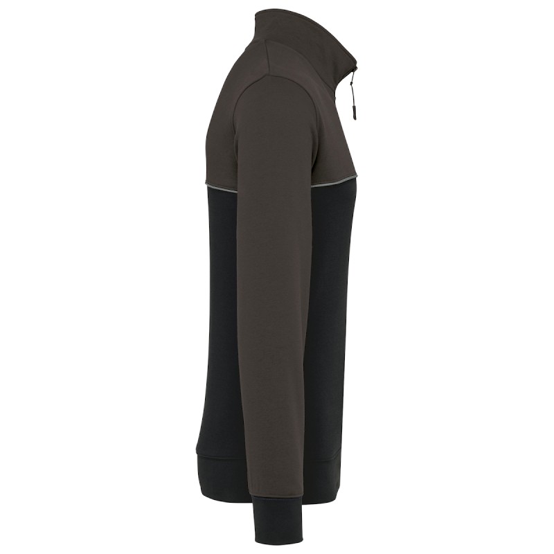 60% coton biologique / 40% polyester recyclé. Molleton gratté 3 fils LSF (Low Shrinkage Fleece). Coupe ajustée. Manches montées. Col avec zip plastique et tire-zip ton sur ton recyclé. Bande de propreté contrastée en chevron. Finition demi-lune encolure dos pour faciliter la personnalisation de marque à l'intérieur. Passepoil contrasté entre les parties du vêtement bicolores (corps et manches devant et dos). Bord-côte 1x1 au bas de manche et de vêtement. Porte-stylo élastiqué 3 compartiments sur la manche gauche au porter. Etiquette de marque Tear Away.