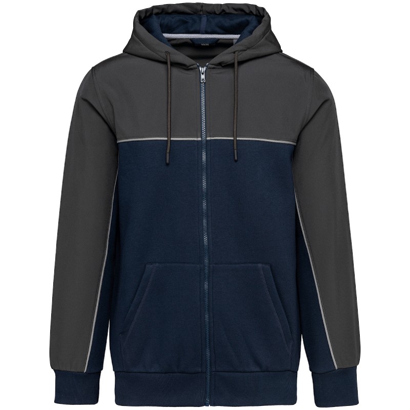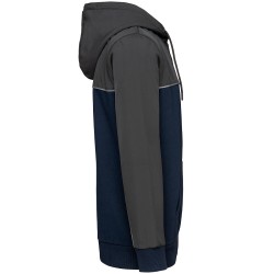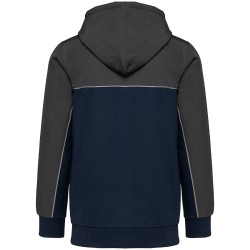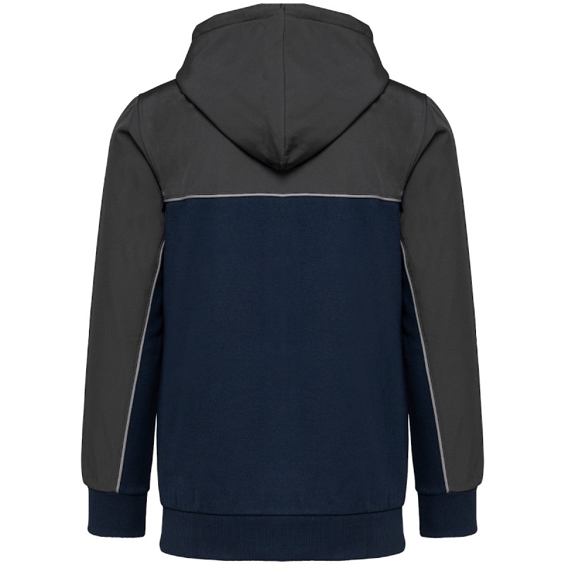 60% coton / 40% polyester recyclé. Tissu empiècements : Softshell 2 couches déperlant 95% polyester / 5% élasthanne. Coupe droite. 2 poches kangourou. Capuche en 2 parties avec cordon de serrage rond avec embouts en caoutchouc. Empiècements devant, dos et hauts de manches en tissu contrasté. Fermeture zippée ton sur ton devant. Demi lune dos en softshell. Passepoil contrasté Silver sur empiècements devant et manches. Lien d'accrochage et bande de propreté en chevron Silver dans le col. Bas de manches et de vêtement en bord-côtes tubulaire 2 x 2. Etiquette de marque détachable.
