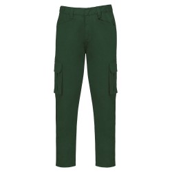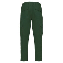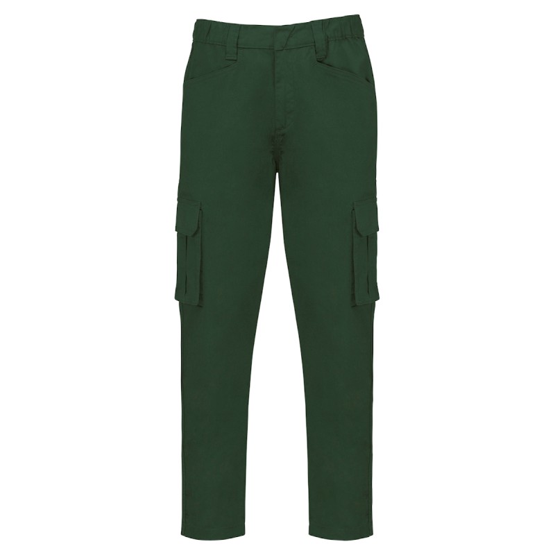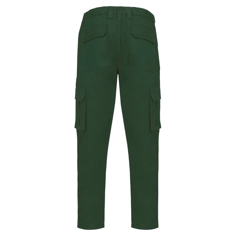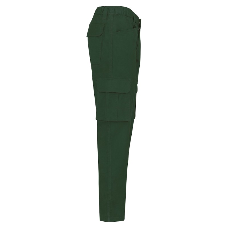 65% coton biologique / 33% polyester recyclé pré-consumer / 2% élasthanne. Tissu sergé. Lavage 60°C. Fermeture zippée et bouton métal caché. Ceinture élastiquée et passants pour plus de confort. Couture de l’entrejambe renforcée par une triple surpiqûre. 2 poches italiennes devant dont 1 avec poche monnaie dans sac de poche droit. 2 poches à soufflet côté et 2 poches arrière avec rabat et fermeture par bande auto-agrippante. Lien d'accrochage outils fixé sur poche arrière gauche. Lien d'accrochage ceinture intérieure. Couture de renfort sur poches pour plus de solidité. Finition double aiguille.