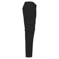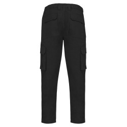 65% coton biologique / 33% polyester recyclé pré-consumer / 2% élasthanne. Tissu sergé. Lavage 60°C. Fermeture zippée et bouton métal caché. Ceinture élastiquée et passants pour plus de confort. Couture de l’entrejambe renforcée par une triple surpiqûre. 2 poches italiennes devant dont 1 avec poche monnaie dans sac de poche droit. 2 poches à soufflet côté et 2 poches arrière avec rabat et fermeture par bande auto-agrippante. Lien d'accrochage outils fixé sur poche arrière gauche. Lien d'accrochage ceinture intérieure. Couture de renfort sur poches pour plus de solidité. Finition double aiguille.