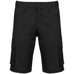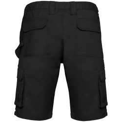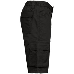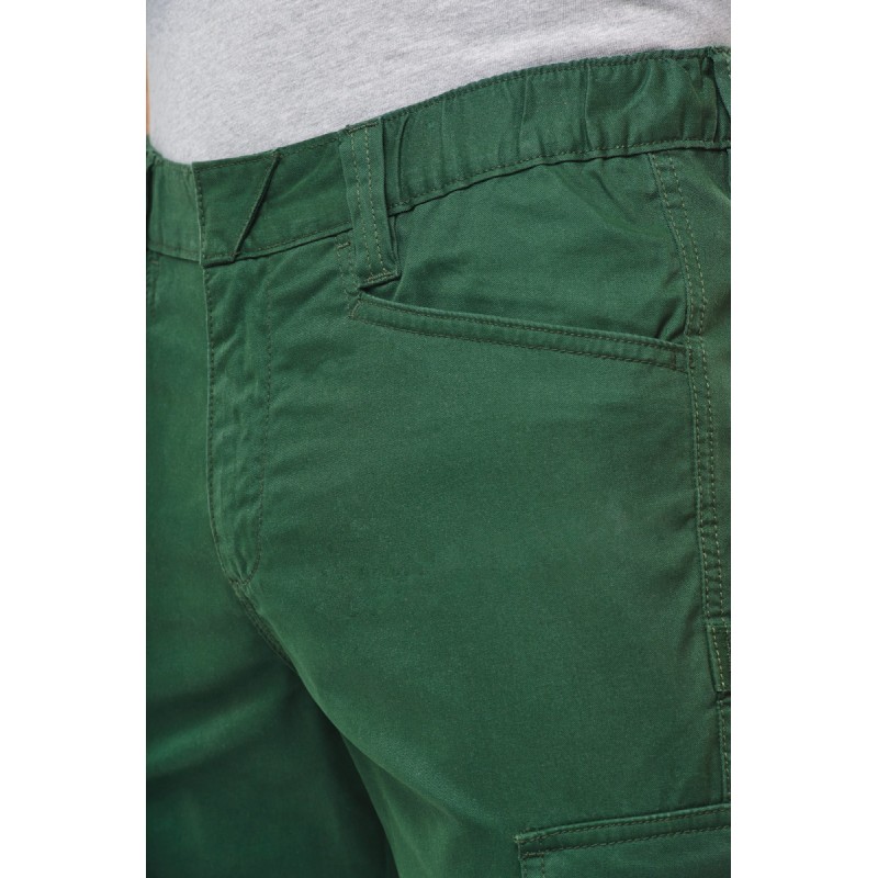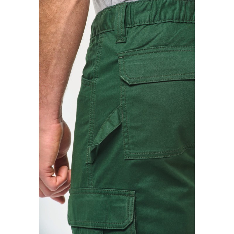 65% de coton biologique / 33% de polyester recyclé / 2% élasthanne. Tissu sergé. Coupe droite. Lavable 60°C. 2 poches ouvertes devant dont 1 poche monnaie et 2 poches à soufflet avec fermeture velcro côtés. 2 poches arrière avec rabat et fermeture velcro. Lien d'accrochage outils à gauche au porté. Ceinture élastiquée avec passants et lien d'accrochage intérieur. Fermeture zippée et boutonnée. Bouton métal protégé par un cache bouton en tissu. Coutures renforcées triple piqûres à l'entrejambe. Etiquette de marque détachable.