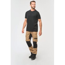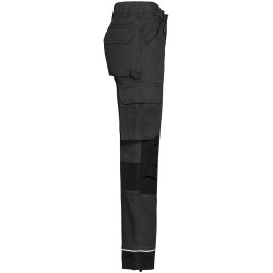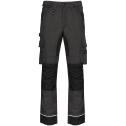 60% coton / 40% de polyester recyclé. Lavage 60°C. Coupe droite. 2 poches devant (sacs de poches en tissu principal) dont 1 avec poche ticket. 2 poches cargo volantes à soufflet et rabat et fermeture velcro dont une à 2 compartiments et emplacements outils, Poche stylos côté droit au porté. 2 poches arrière à soufflet avec rabat et fermeture velcro, Porte-marteau à gauche au porté. Mousse de confort genou intégrée dans une poche en Cordura® contrasté (noir pour toutes les couleurs). Empiècement extensible contrasté (sauf coloris noir) à l'entrejambe, à l'arrière des genoux pour plus de résistance et une parfaite liberté de mouvement. Empiècement bas de jambe en Cordura® avec piping silver et ourlet ajustable de 5 cm. Triple piqûres fourche dos et devant. Double piqûres côtés et entrejambe. Ceinture avec boucle plastique + passants ajustable grâce à un élastique. Large passant à l'arrière de la ceinture. Fermeture zippée et boutonnée (bouton métal recouvert de plastique). Etiquette de marque détachable. Vendu sans accessoire. Compatible avec WKI0306 : poches à outils amovibles.