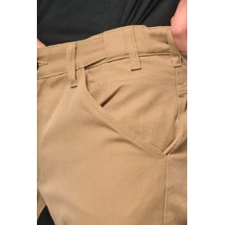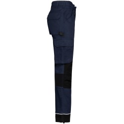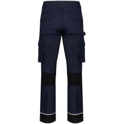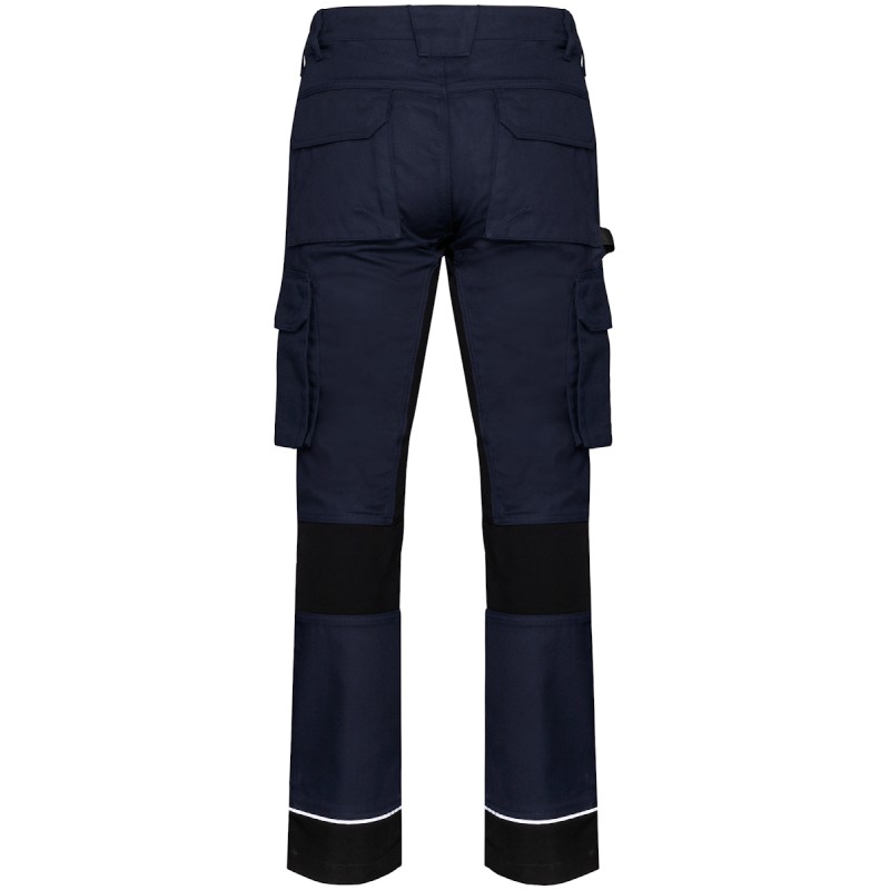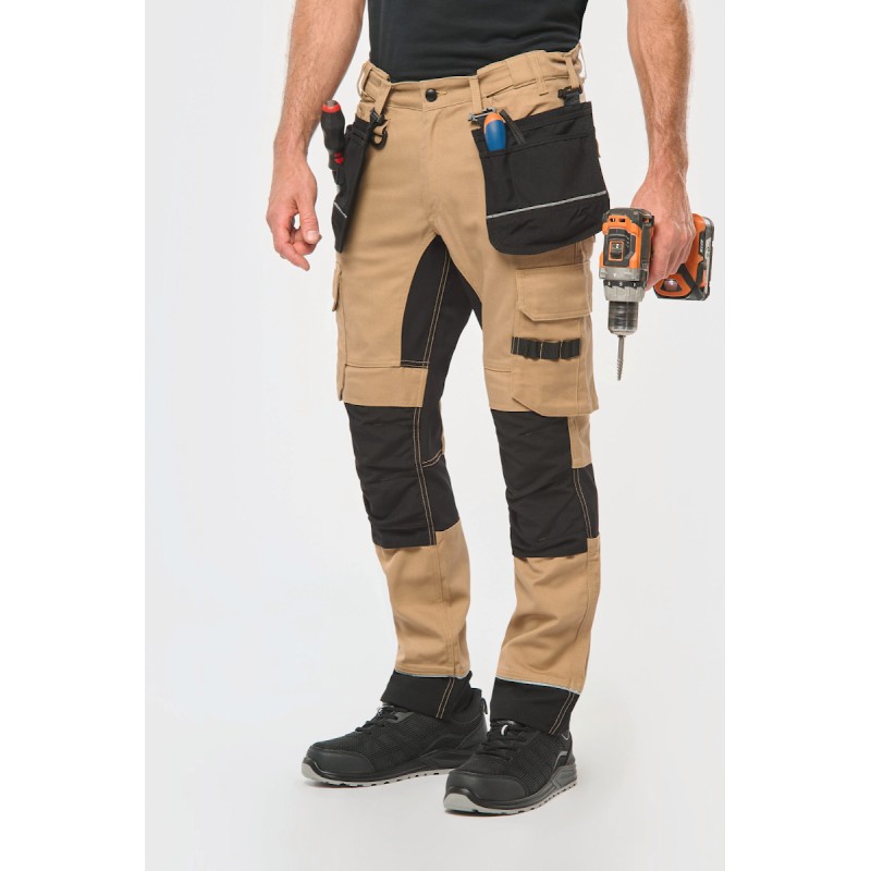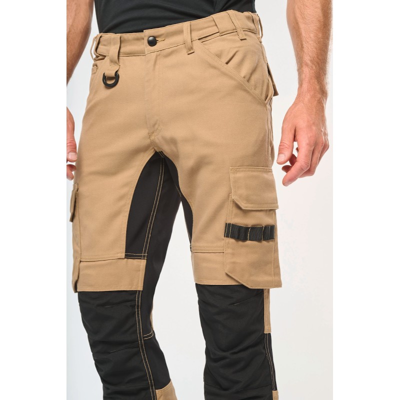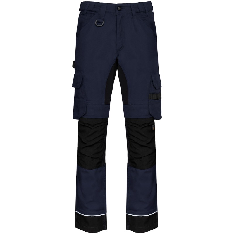 60% coton / 40% de polyester recyclé. Lavage 60°C. Coupe droite. 2 poches devant (sacs de poches en tissu principal) dont 1 avec poche ticket. 2 poches cargo volantes à soufflet et rabat et fermeture velcro dont une à 2 compartiments et emplacements outils, Poche stylos côté droit au porté. 2 poches arrière à soufflet avec rabat et fermeture velcro, Porte-marteau à gauche au porté. Mousse de confort genou intégrée dans une poche en Cordura® contrasté (noir pour toutes les couleurs). Empiècement extensible contrasté (sauf coloris noir) à l'entrejambe, à l'arrière des genoux pour plus de résistance et une parfaite liberté de mouvement. Empiècement bas de jambe en Cordura® avec piping silver et ourlet ajustable de 5 cm. Triple piqûres fourche dos et devant. Double piqûres côtés et entrejambe. Ceinture avec boucle plastique + passants ajustable grâce à un élastique. Large passant à l'arrière de la ceinture. Fermeture zippée et boutonnée (bouton métal recouvert de plastique). Etiquette de marque détachable. Vendu sans accessoire. Compatible avec WKI0306 : poches à outils amovibles.