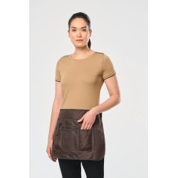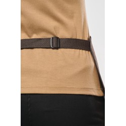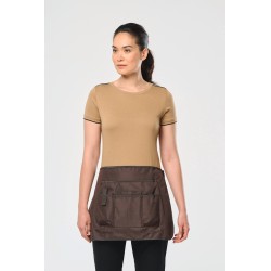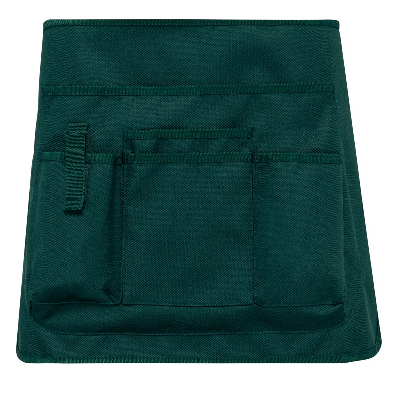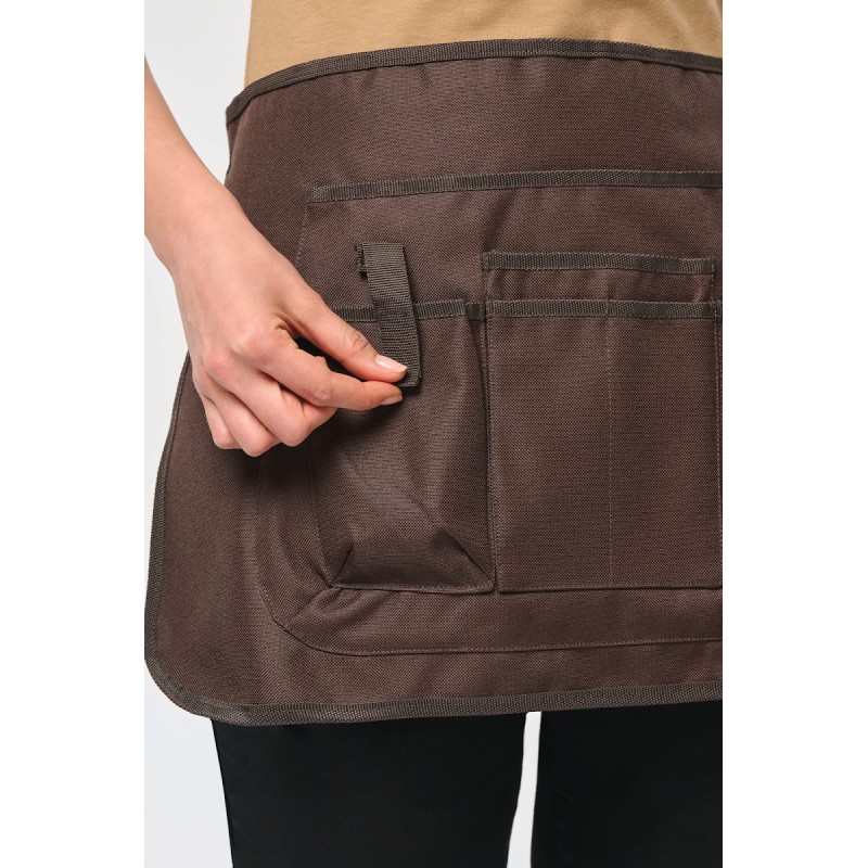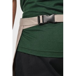 100% polyester recyclé. Tissu Oxford enduit et imperméable 4000 mm. 2 niveaux de poches : 1 grande poche centrale milieu + 4 poches dont 1 avec double compartiments et 1 avec patte et bande auto-agrippante. Biais de finition ton sur ton. Lanière et boucle de réglage en plastique recyclé pour ajuster la taille du tablier. Hauteur totale tablier = 35 cm. Largeur bas du tablier = 54 cm. Étiquette détachable.