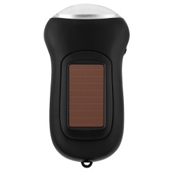Lampe torche dynamo/solaire Système Dynamo® Autonomie d'1h (6-8h de charge solaire/20min de tours de manivelle) Matière : Plastique ABS Norme d'étanchéité : IPX3 35 lumens Lumière LED Emballage en carton recyclé issu de la gestion durable des forêts Lumière frontale : 35 Lumens Capacité 40 mAh Espace d'impression: T7 partie supérieure 20x10 / T7 sur le côté 25x5 Dimensions de l'article: 93x50x29 mm