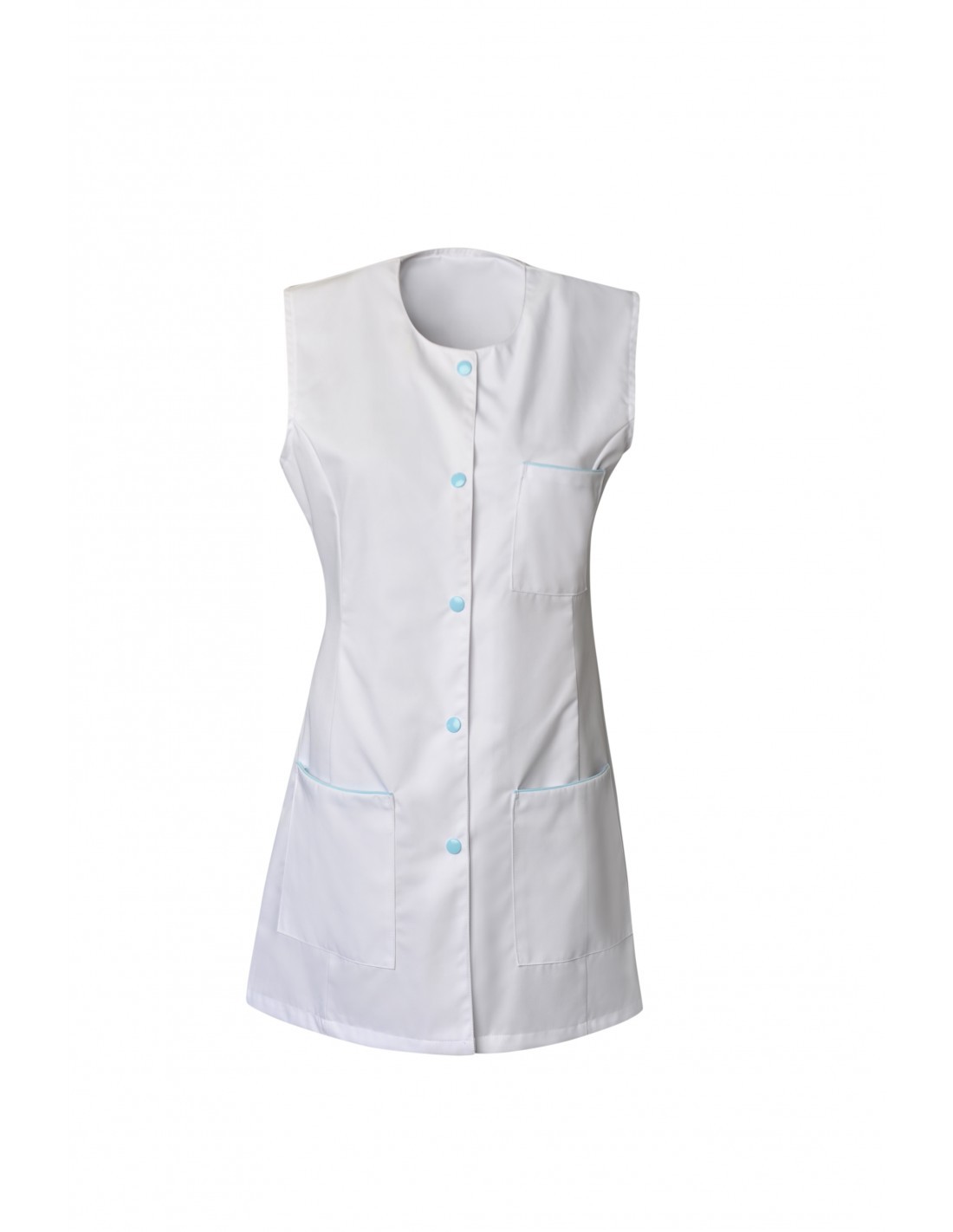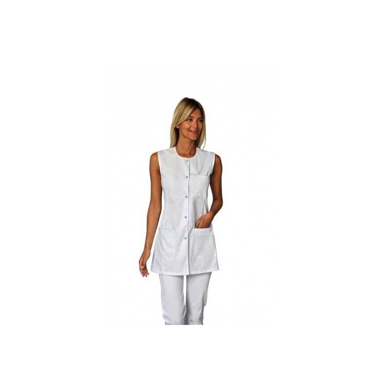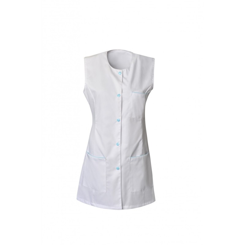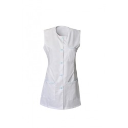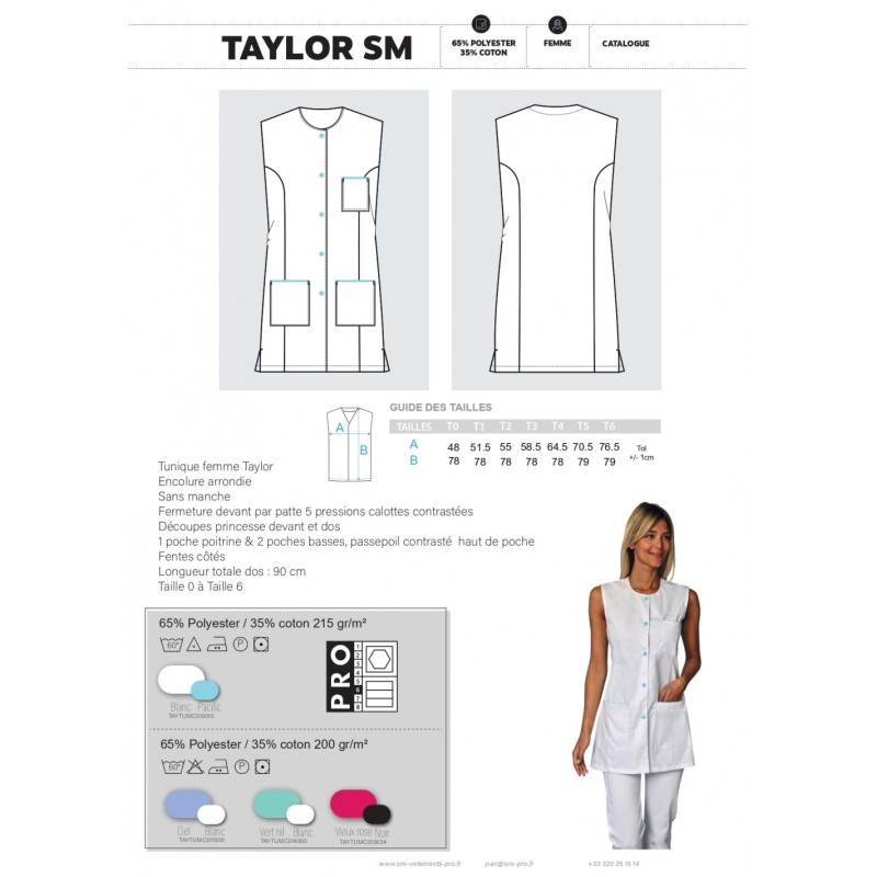 Tunique pour femme sans manches TAYLOR. Avec encolure arrondie, 5 pressions calotte, découpe princesse et fentes côtés. hauteur dos : 80 cm. Taille XS à 3XL. Poly/coton 195 grs.