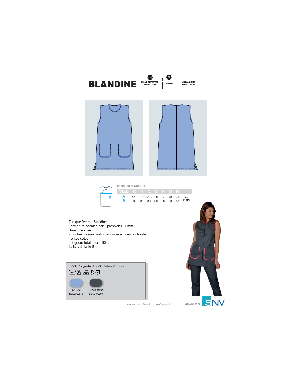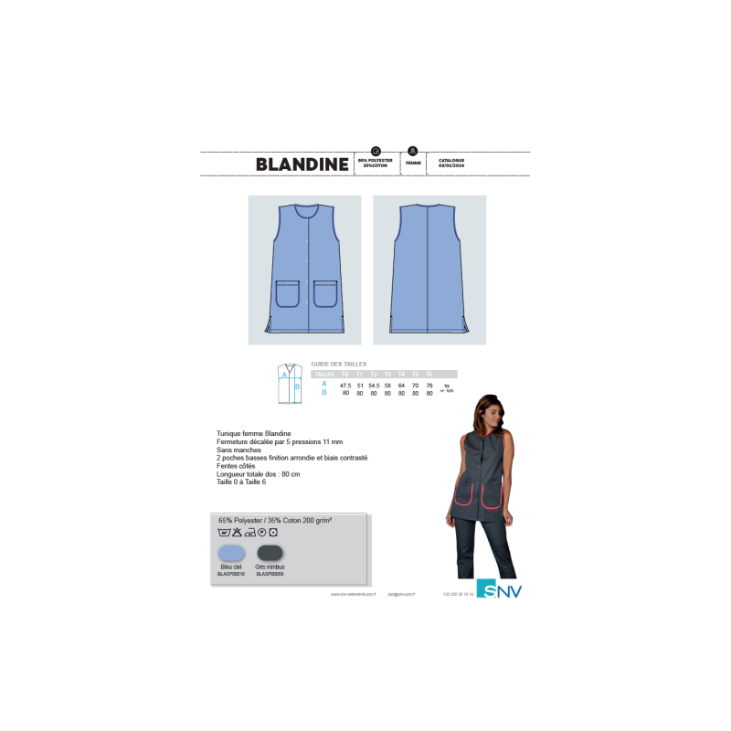 Tunique pour femme sans manches BLANDINE. Fentes côtés. Pressions. H80 cm.