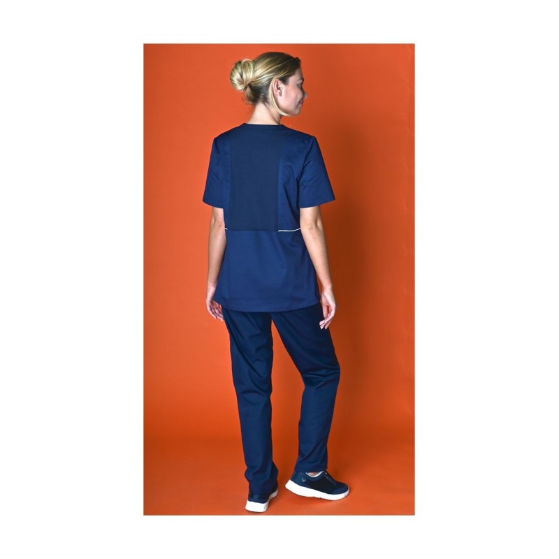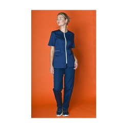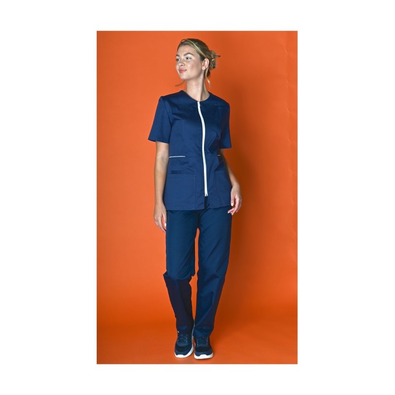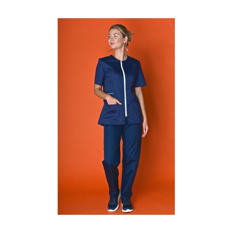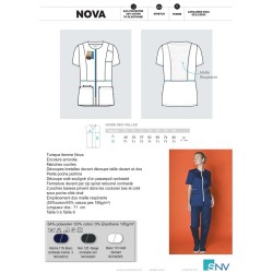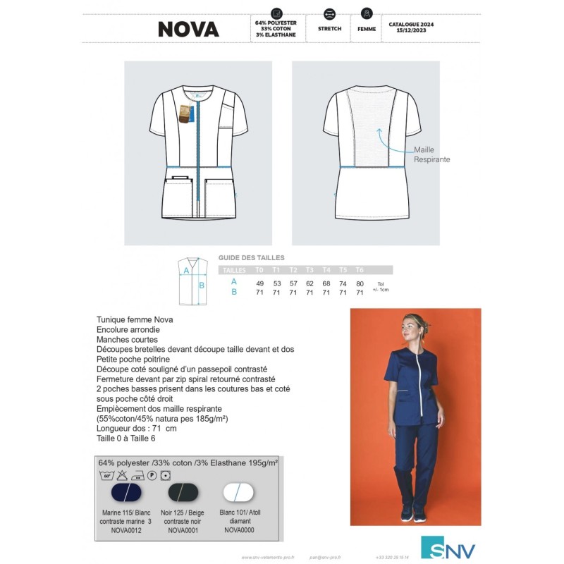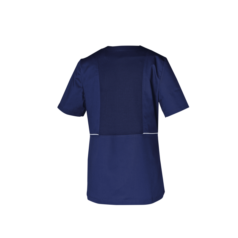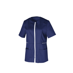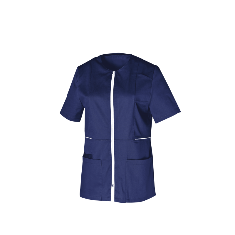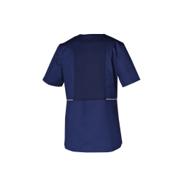 Tunique manches courtes pour femme NOVA. Découpes bretelles devant découpe taille devant et dos. Découpe coté souligné d’un passepoil contrasté. Fermeture par zip spiral retourné contrasté. 1 poche poitrine. 2 poches basses. Sous poche téléphone coté droit. Empiècement dos maille respirant. Hauteur: 71 cm. Tailles XS à 3XL. Principal : Polyester/coton/ élasthanne 195g. Secondaire : maille 55% coton / 45% Natura pes 185grs.