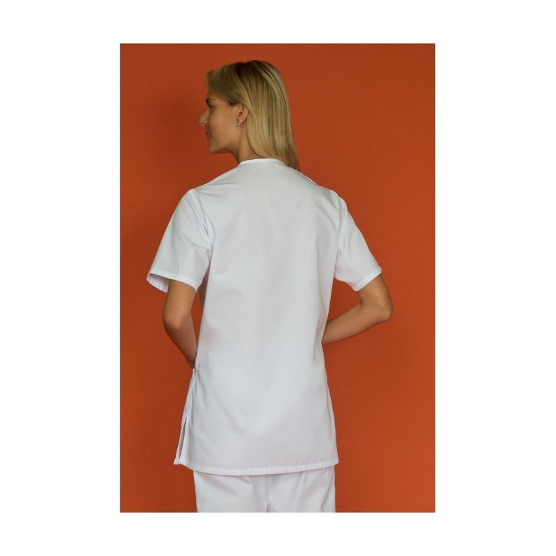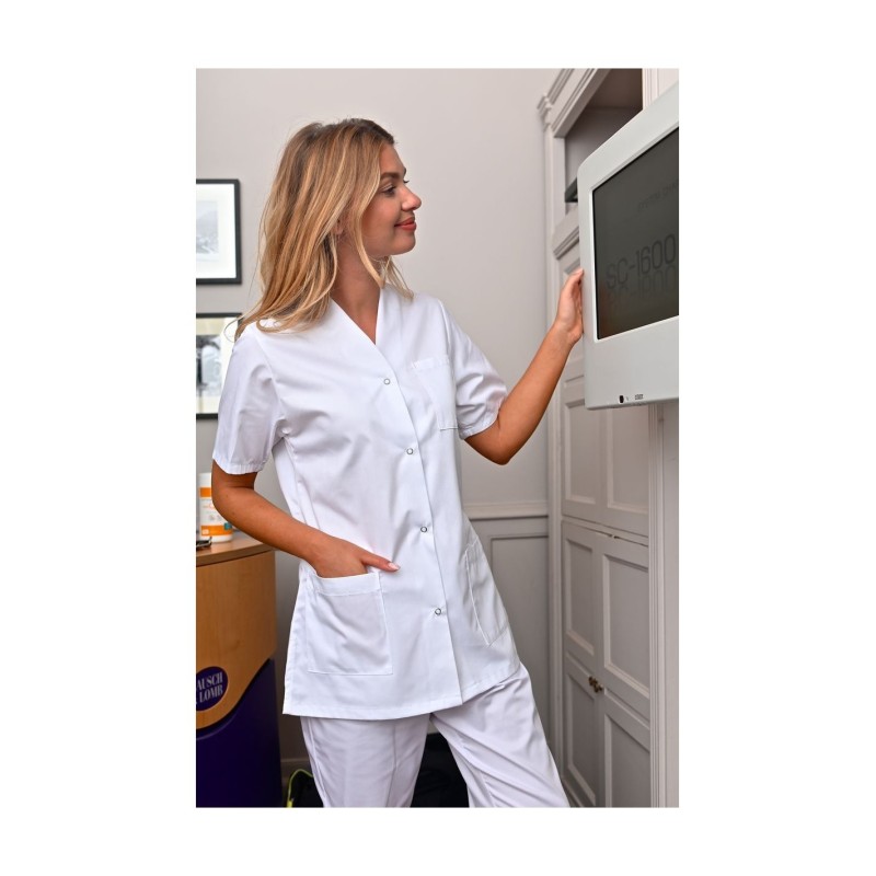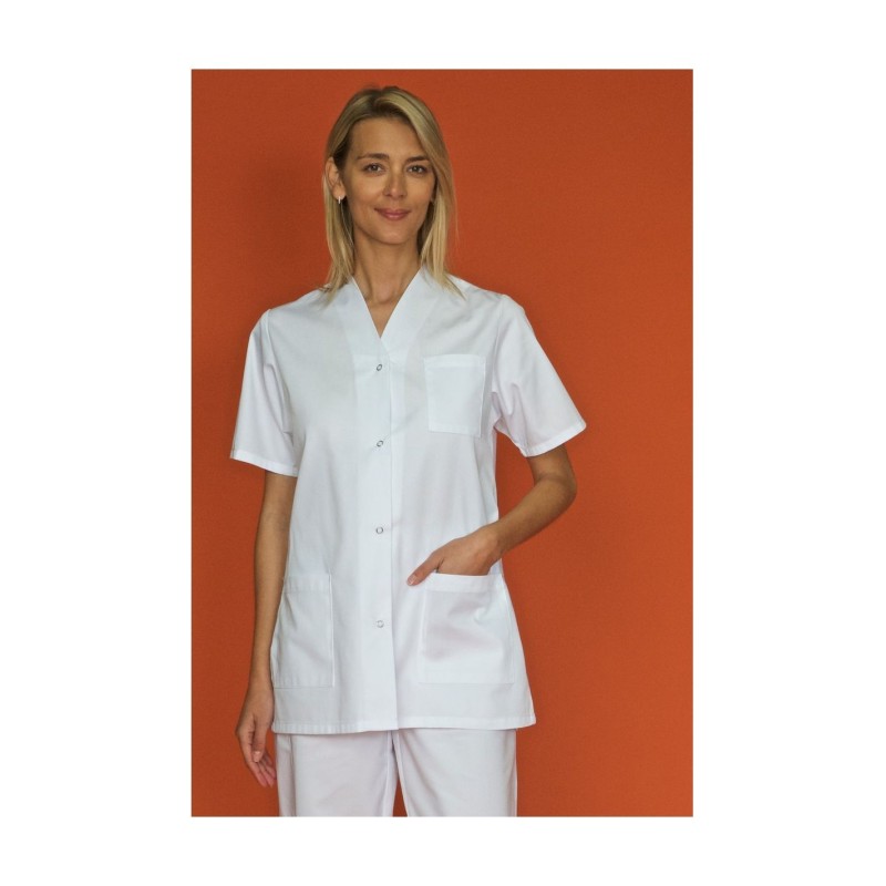 Tuniques manches courtes VIVIANE pour femme. Fentes côtés. Fermeture centrale par pressions. Hauteur : 75cm. Tailles XS à 3XL.