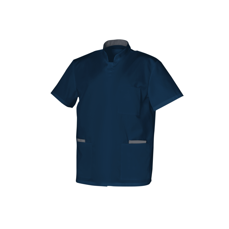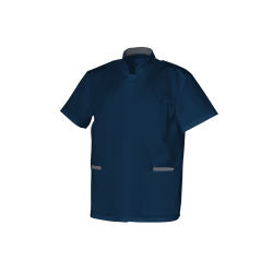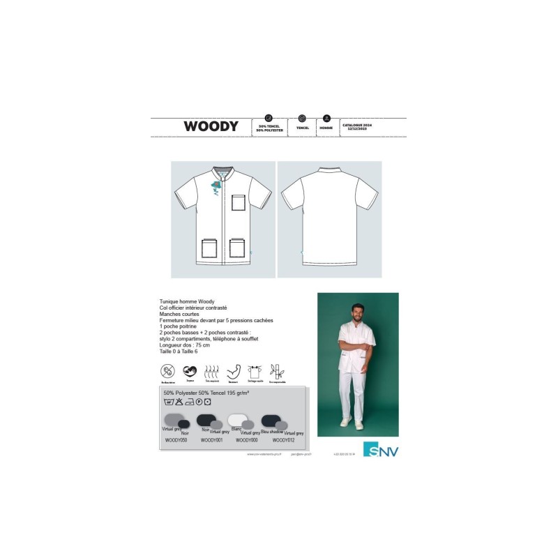 Tuniques WOODY manches courtes pour Homme. Col officier. Pressions cachées. 1 poche poitrine. 2 poches basses avec compartiment stylo et téléphone. Hauteur : 75cm.