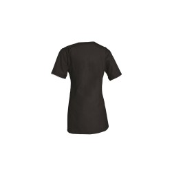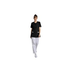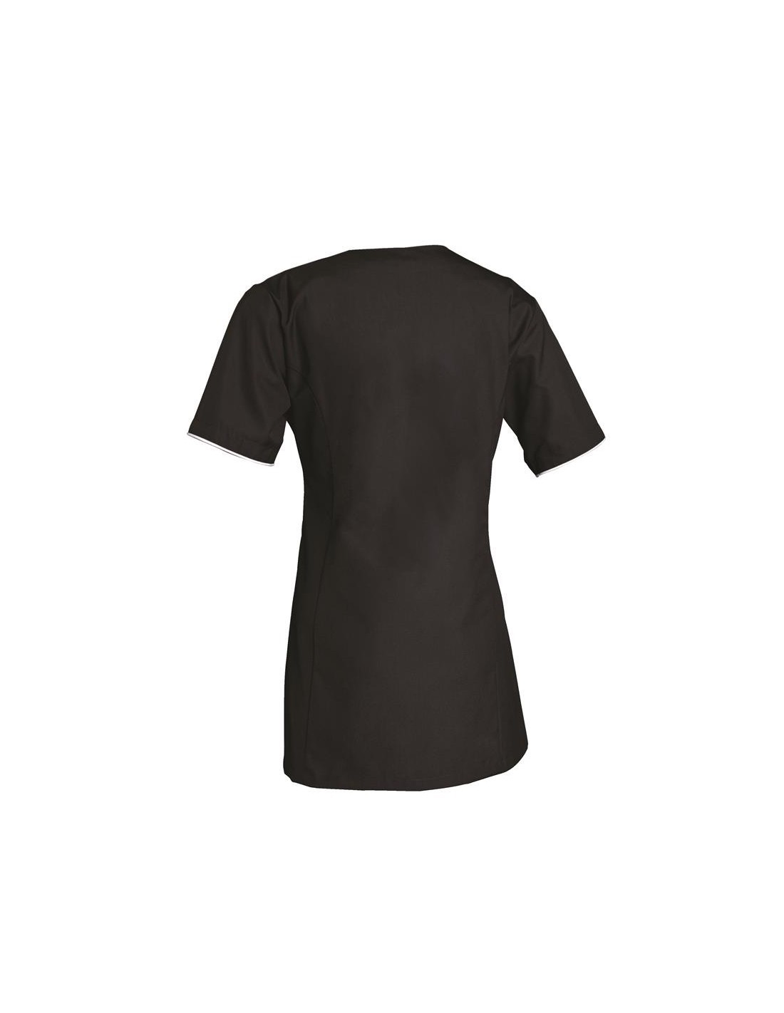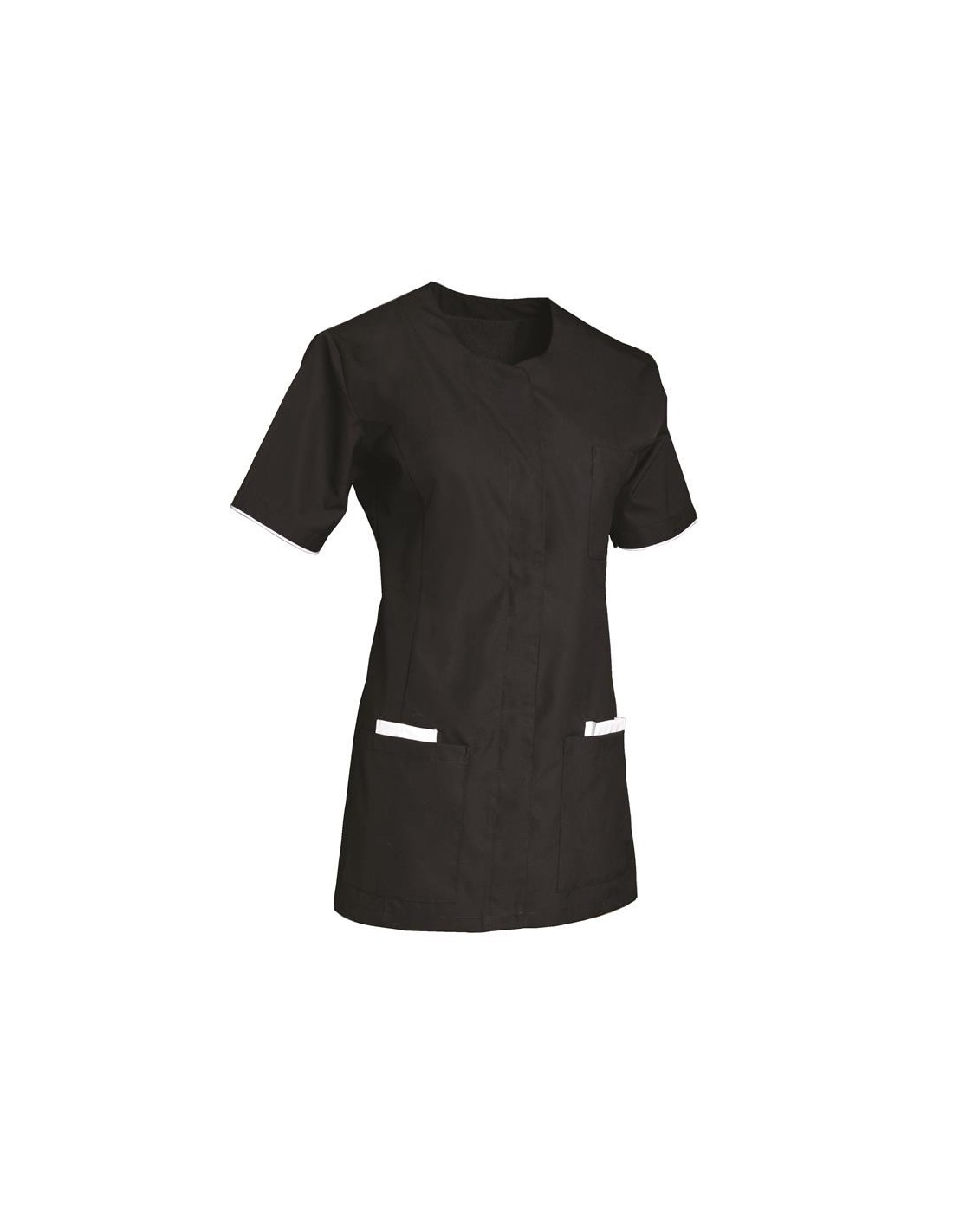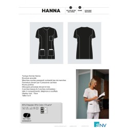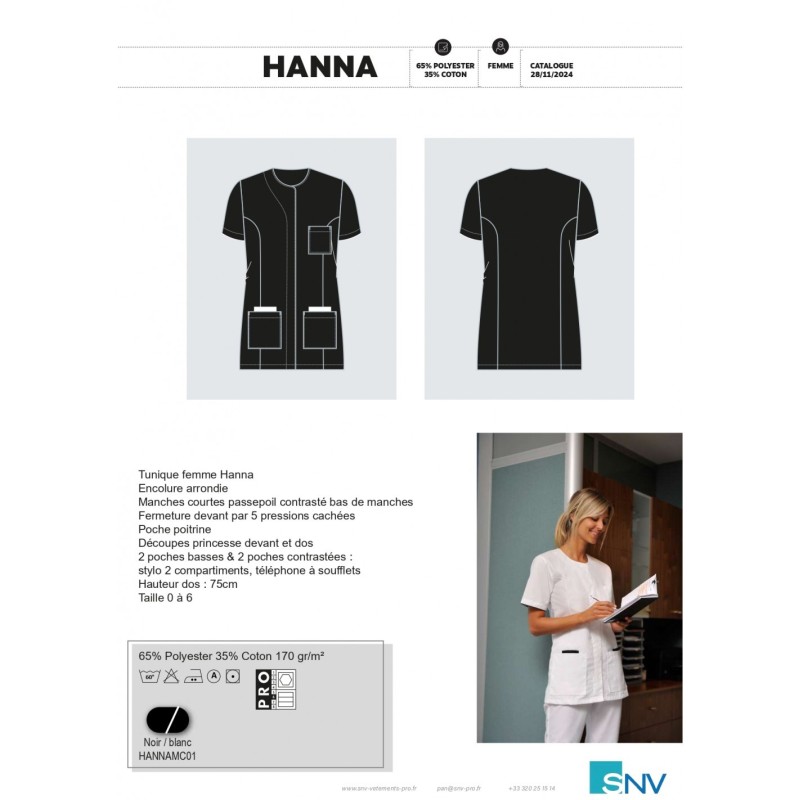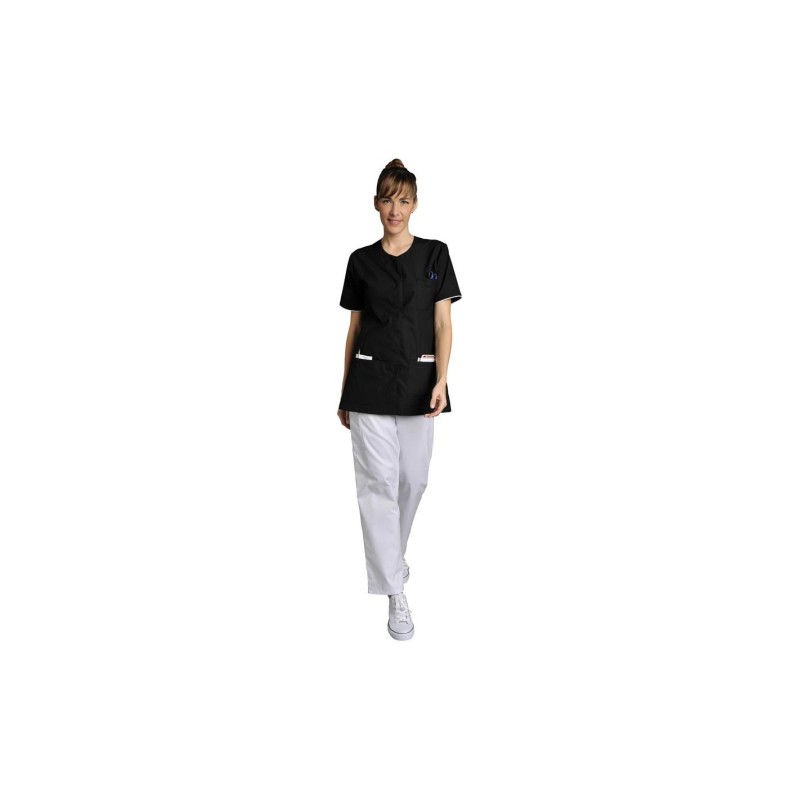 Tunique HANNA manches courtes passepoil pour femme. Découpe princesses. Contrasté bas de manche. Encolure arrondie. 3 poches dont deux poches basses avec soufflet intérieur contrasté pour stylo et téléphone. Coupe ajustée. Fermeture pressions cachées. Hauteur : 75cm.