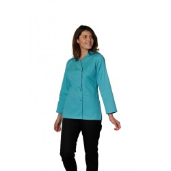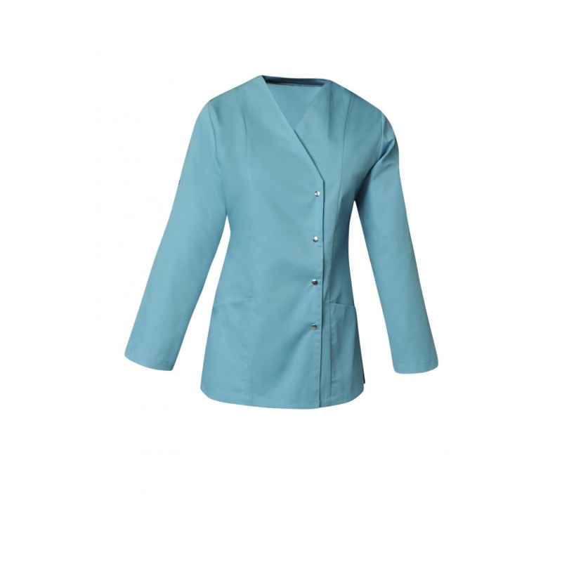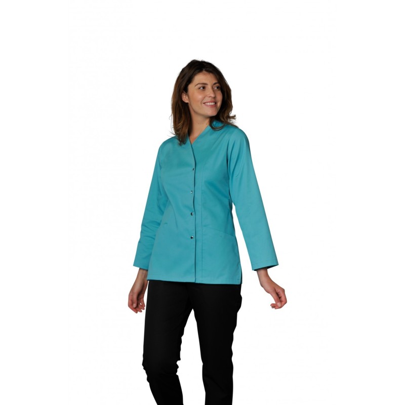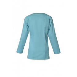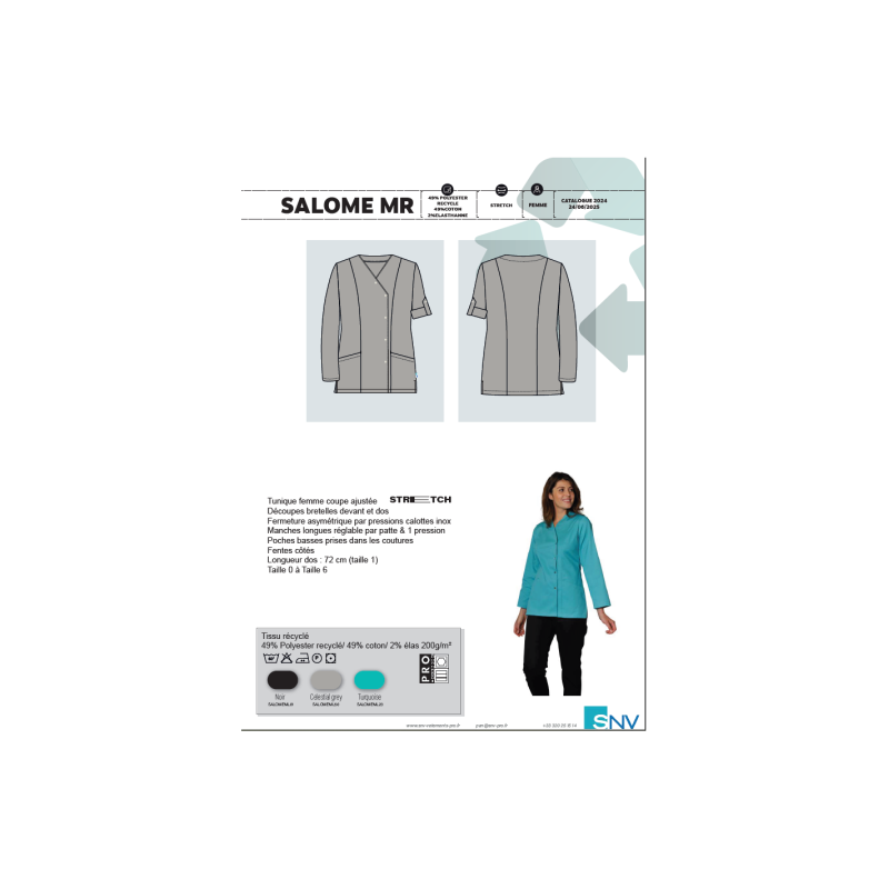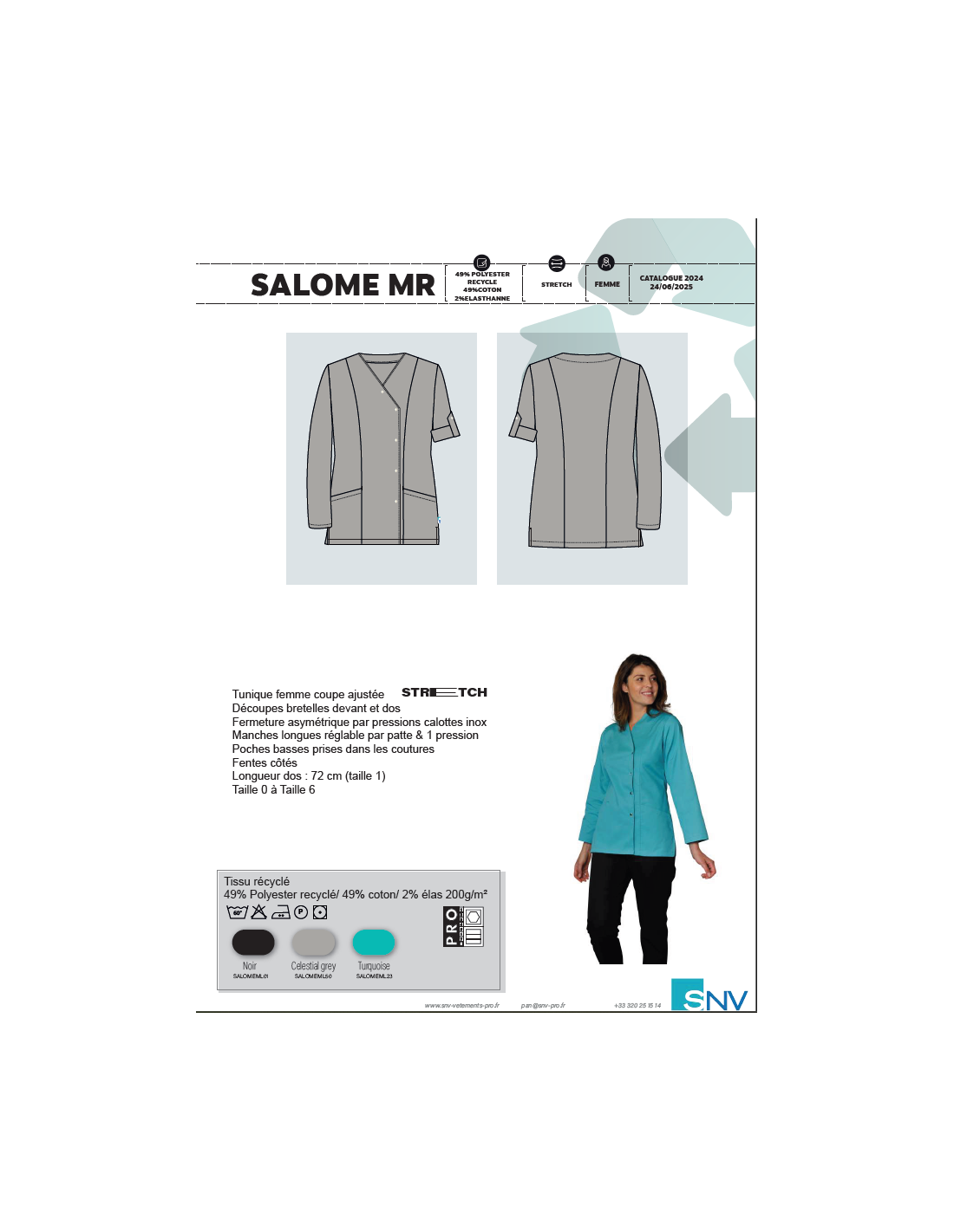 Tunique SALOME manches longues relevables avec pressions. Découpe bretelle devant et dos. Fermeture décalée par pressions avec calotte inox. Deux poches basses discrètes prises dans les coutures. Fentes sur les côtés. Coupe ajustée. Hauteur : 72cm.