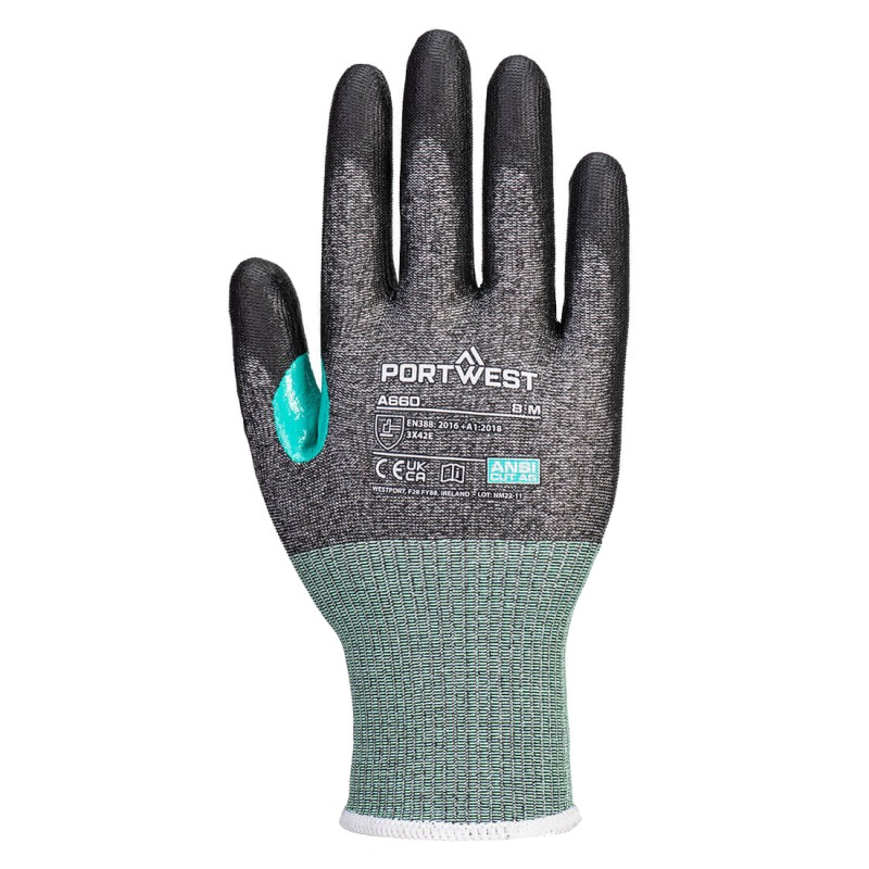 Gant résistant aux coupures niveau E jauge 18 avec revêtement en PU offrant une prise sûre dans les environnements de manipulation secs et légèrement huileux. Un renfort pouce ajoute une durabilité supplémentaire. La doublure respirante de jauge 18 offre une dextérité et un confort optimaux. Convient pour une utilisation avec des appareils à écran tactile. Le marquage rétro réfléchissant augmente la visibilité des gants dans des conditions de faible luminosité.