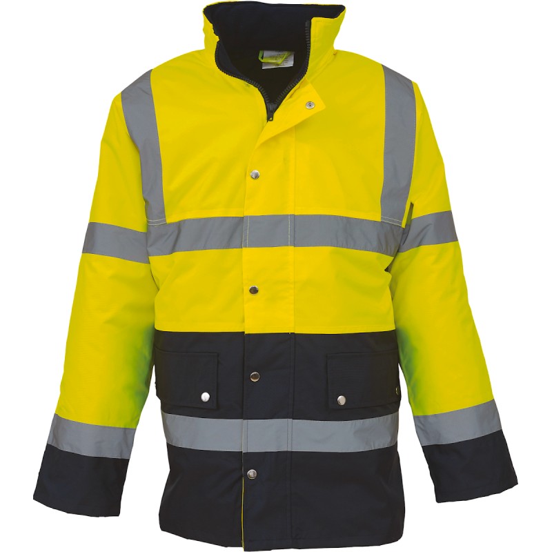 100% polyester 300 D avec revêtement PU imperméable, rembourrage matelassé de 190 g/m² et doublure en nylon. Deux bandes réfléchissantes 3M de 5 cm autour du corps et des bras, et une sur chaque épaule. Zip ultra-résistant à l'avant avec rabat tempête doté de boutons pressions. Deux poches extérieures avec rabat tempête. Poignets protège tempête en tricot. Capuche avec cordons intégrée dans le col. Poche intérieure au niveau de la poitrine. Coutures cousues et collées pour une étanchéité parfaite. Conforme à la norme EN ISO20471:2013 catégorie 3 et EN343 cat. 3 niv.1 relative à la protection contre le mauvais temps. Hi-Vis Orange/Navy également conforme à la norme relative aux 'Vêtements de Haute Visibilité' des chemins de fer UK GO/RT 3279 Issue 8:2013. 25 lavages maximum recommandés. Lavable en machine 40°C. Pas de lavage à sec.