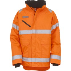 100% polyester rip stop imperméable et respirant. Sous-couche velours détachable. Bandes rétro-réfléchissantes finition double aiguille (larg. 5 cm). Col doublé en velours avec capuche détachable intégrée. Fermeture zippée à double curseur. Poches extérieures bas avec double accès haut et côté, doublées en polaire. Poche stylo et poche mobile sur le bras gauche. Poche poitrine côté droit avec fermeture zippée étanche et poche pour pièce d'identité pouvant être dissimulée. Boucle porte radio à la poitrine côté droit. Espace pour la personnalisation côté cœur et zip de personnalisation invisible sur le bas du vêtement. Conforme aux normes EN ISO 20471 de catégorie 3, EN342:2004 de protection contre le froid et à la norme relative aux "Vêtements de Haute Visibilité" des chemins de fer UK GO/RT 3279 Issue 8:2013 (Hi-Vis Orange uniquement).