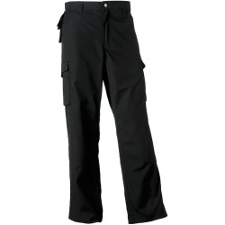 65% polyester / 35% canvas de coton. Enduit de protection anti-taches avec DuPont™ Teflon® fabric protector. Poches cargo sur chaque jambe avec compartiments pratiques sur la jambe droite. Poches intérieures pour genouillères. Poche triple surpiqûre et coutures intérieures pour plus de résistance. Poche pour téléphone sous la ceinture. 2 poches fonctionnelles à l'arrière : 1 ouverte et 1 avec rabat. Fermeture zippée YKK. Fond renforcé, idéal pour le travail manuel. Taille max des genouillères : 21 cm x 15 cm. Lavage en machine à 60°C et séchage au sèche-linge. Longueur du pantalon pour toutes les tailles: 81 cm.