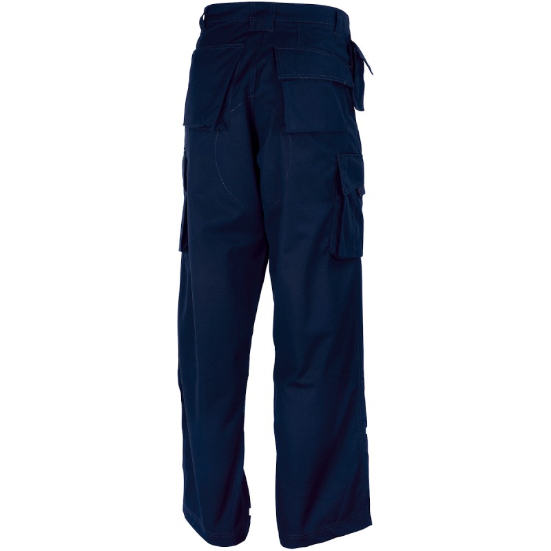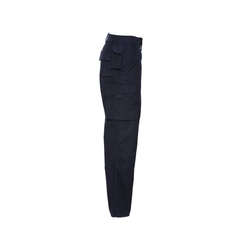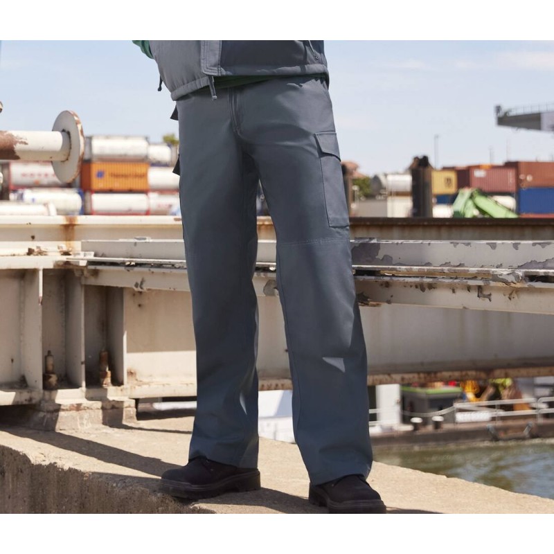 65% polyester / 35% canvas de coton. Enduit de protection anti-taches avec DuPont™ Teflon® fabric protector.  Poches cargo sur chaque jambe avec compartiments pratiques sur la jambe droite. Poches intérieures pour genouillères. Poche triple surpiqûre et coutures intérieures pour plus de résistance. Poche pour téléphone sous la ceinture. 2 poches fonctionnelles à l'arrière : 1 ouverte et 1 avec rabat. Fermeture zippée YKK. Fond renforcé, idéal pour le travail manuel. Taille max des genouillères : 21 cm x 15 cm. Lavage en machine à 60°C et séchage au sèche-linge. Longueur du pantalon pour toutes les tailles: 81 cm.
