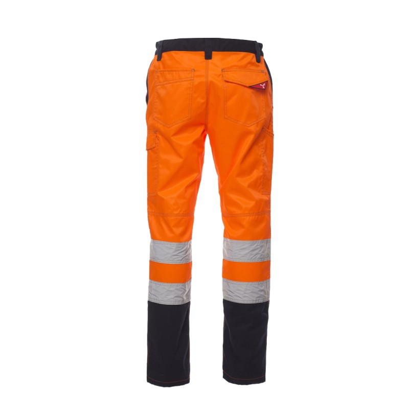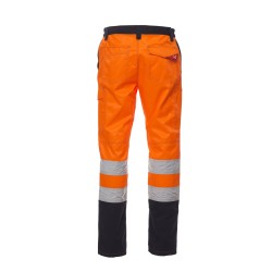 Pantalon homme multi-saison à haute visibilité bicolore avec bandes réfléchissantes, élastiques latéraux et passants à la taille, fermeture par zip et bouton en plastique, deux poches de coupe classique sur le devant, poche latérale LOCK SYSTEM, porte-mètre, deux poches arrière une ouverte et une avec rabat et velcro. Coutures en contraste, entrejambe et intérieur jambes à triple aiguille.