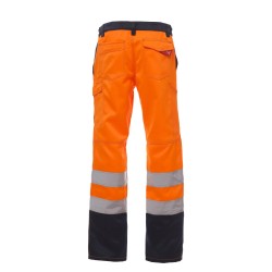 Pantalon homme d'hiver à haute visibilité bicolore avec bandes réfléchissantes, élastiques latéraux et passants à la taille, fermeture par zip et bouton en plastique, deux poches de coupe classique sur le devant, poche latérale LOCK SYSTEM, porte-mètre, deux poches arrière une ouverte et une avec rabat et velcro. Coutures en contraste, entrejambe et intérieur jambes à triple aiguille.