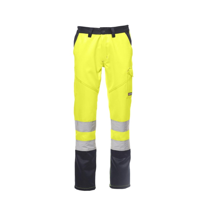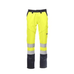 Pantalon homme d'hiver à haute visibilité bicolore avec bandes réfléchissantes, élastiques latéraux et passants à la taille, fermeture par zip et bouton en plastique, deux poches de coupe classique sur le devant, poche latérale LOCK SYSTEM, porte-mètre, deux poches arrière une ouverte et une avec rabat et velcro. Coutures en contraste, entrejambe et intérieur jambes à triple aiguille.