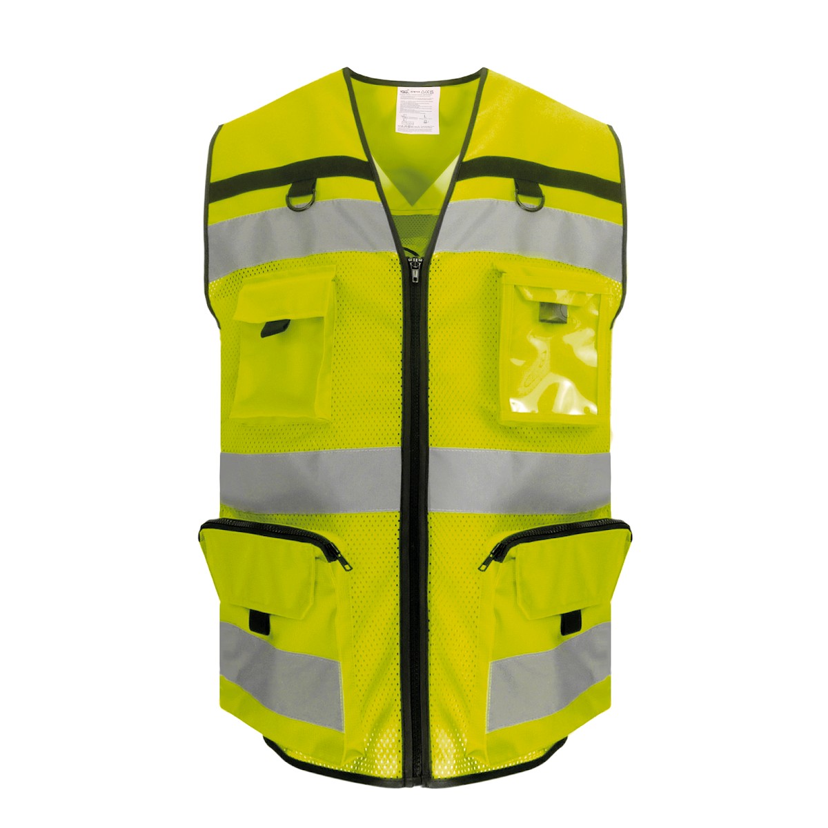 100% Polyester. Gilet Hi-Vis résistante avec de nombreuses poches pour plus de commodité au travail. Deux poches doubles accessibles par le haut avec une fermeture à glissière et une fermeture à crochets et à boucles. Anneaux en D. Poches de poitrine avec fermeture à rabat et tirettes. Affichage de carte d'identité. Ourlet réglable par deux boutons pression. Avec une maille ouverte sur le bas, offrant une meilleure respirabilité et un meilleur confort dans les environnements de travail et les saisons chaudes. Conforme à la norme EN ISO20471:2013 Classe 2 ; Grande zone de décoration dans le dos.