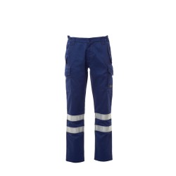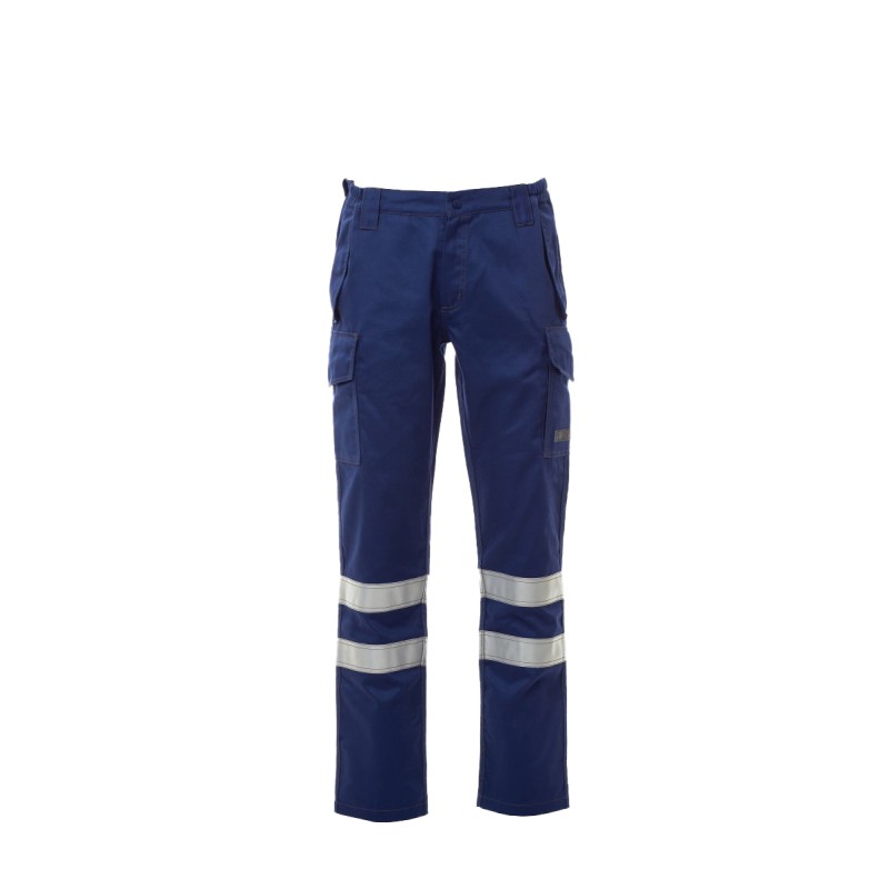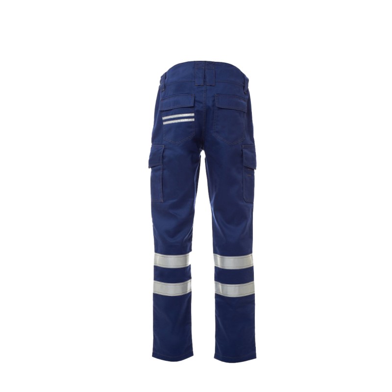 Pantalon en coton antistatique, antiacide, ignifuge, résistant aux arcs électriques et adapté aux soudeurs, avec double bande réfléchissante, ceinture profilée plus haute dans le dos pour une meilleure couverture avec élastiques latéraux et passepoilées à la taille, devant avec zip à bouton-pression. Double piqûre en contraste et renforcée sur la jambe intérieure, extérieure et arrière. Poches avant de coupe classique, deux poches multifonctions plus une poche à fermeture éclair, deux poches arrière, toutes avec rabats de couverture à fermeture Velcro. Bandes 3M rétroréfléchissantes appliquées sur la poche arrière.