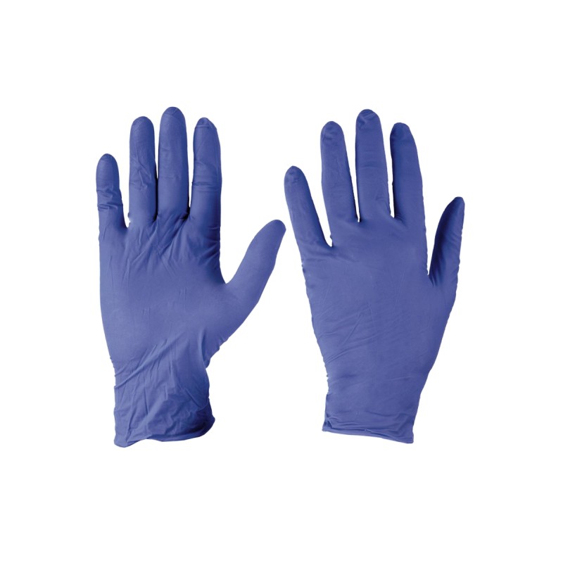 Gants en nitrile jetables, ambidextres, non poudrés, poids individuel 3,5 g (taille M), épaisseur moyenne 0,06 mm (mesurée sur la paume). Caractéristiques : très résistant. Atouts : confort, dextérité, préhension, sensibilité, précision, résistant aux liquides. Utilisations : contact avec les aliments, manipulations légères et assemblage de précision requérant une résistance chimique aux détergents, détersifs et hydrocarbures, liquides et graisse en général. Conditionnement au catalogue : boîte de 100 unités. Unité minimum commercialisable : 10 boîtes (1 000 unités).