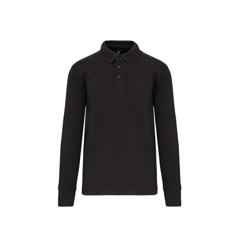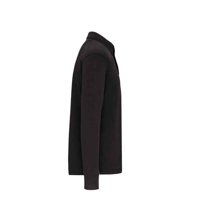 80% coton / 20% polyester. Molleton 3 fils avec traitement LSF. Lavable à 60°C. Col polo et bas de manches en bord-côte. Patte de boutonnage col 3 boutons en métal recouverts de plastique, idéal pour les métiers de l'industrie alimentaire. Passe-fil dans la poche + passant encolure pour écouteurs. Poche zippée invisible côté droit. Renforts épaules. Porte-stylo sur manche gauche. Finition demi-lune au dos. Lien d'accrochage dans le col. Finition double aiguille au bas du vêtement et dos rallongé pour plus de confort.