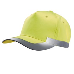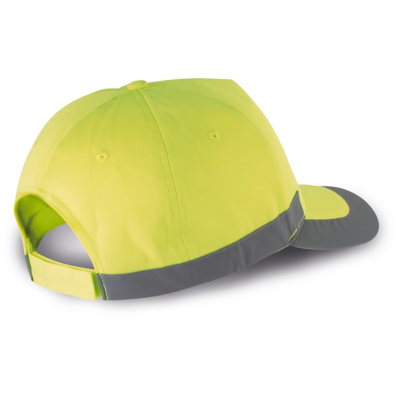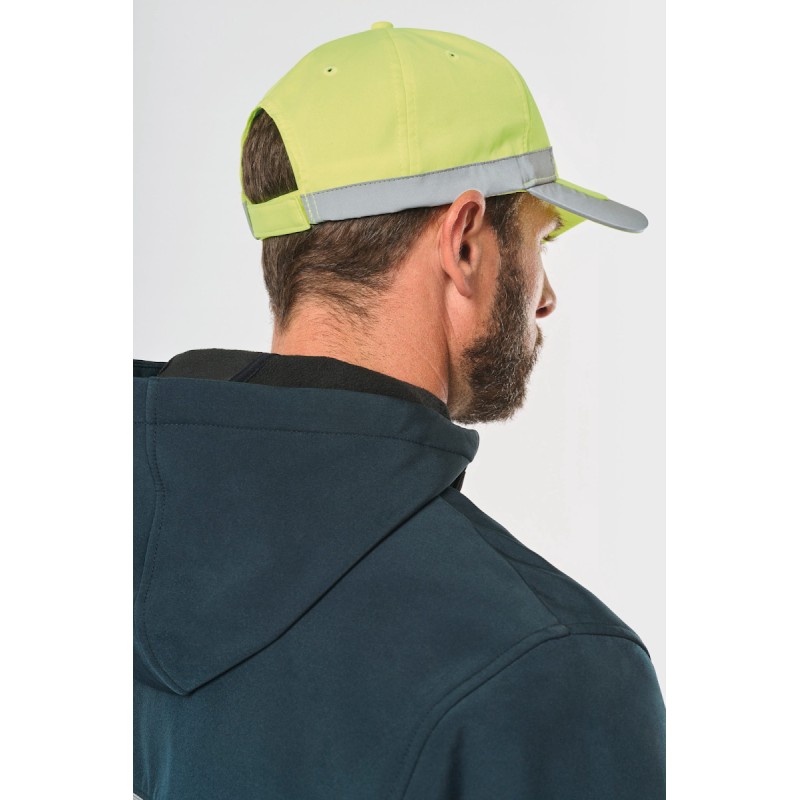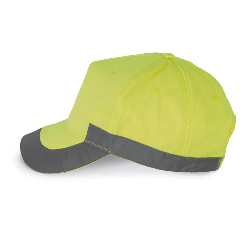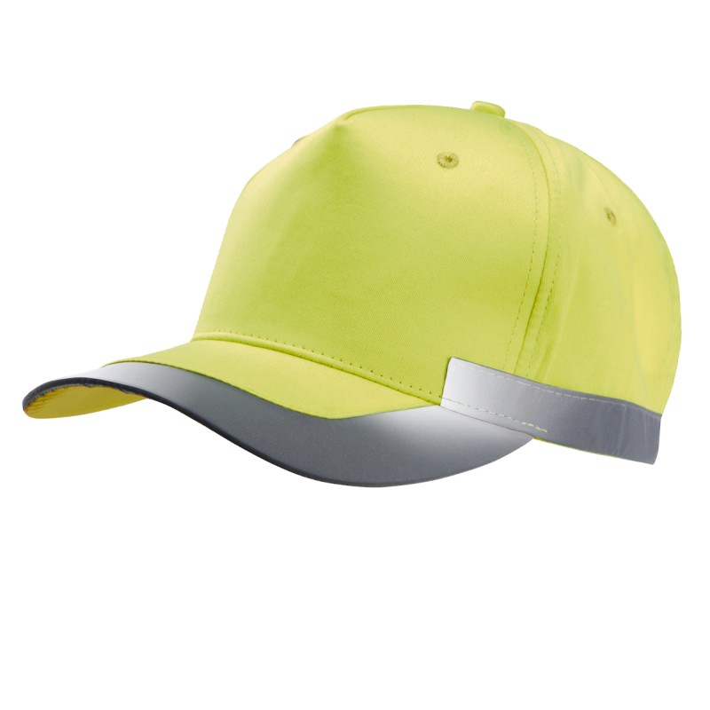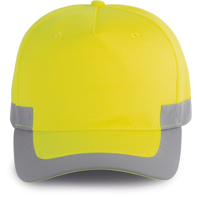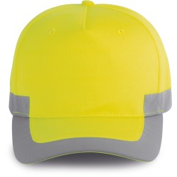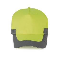 100% polyester. 5 panneaux. Casquette fluorescente. Fermeture réglable par bande auto-agrippante.