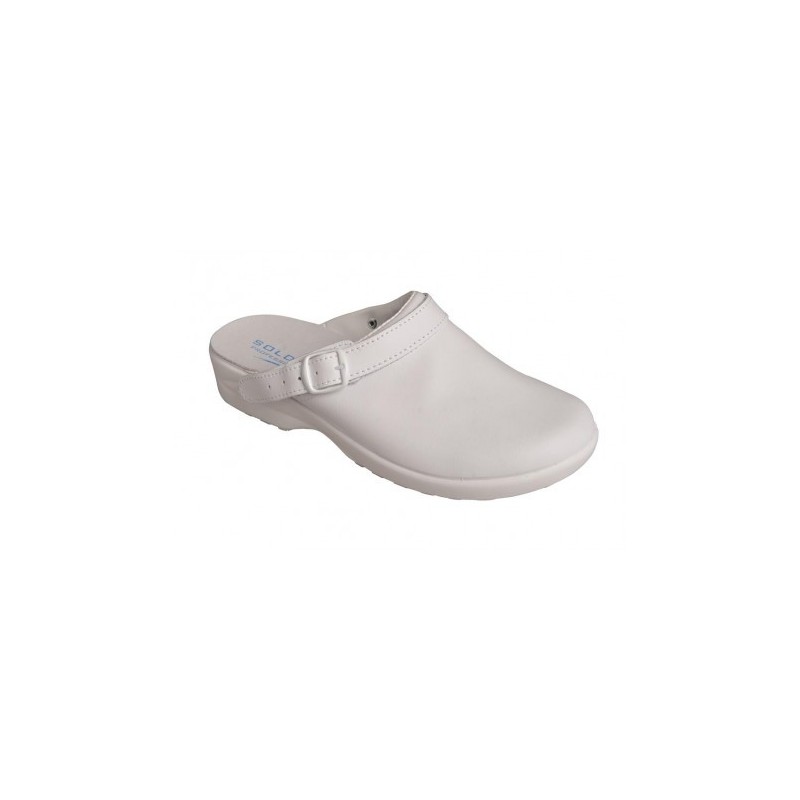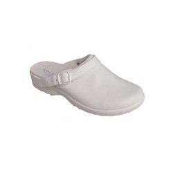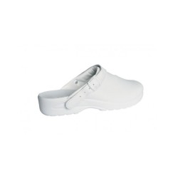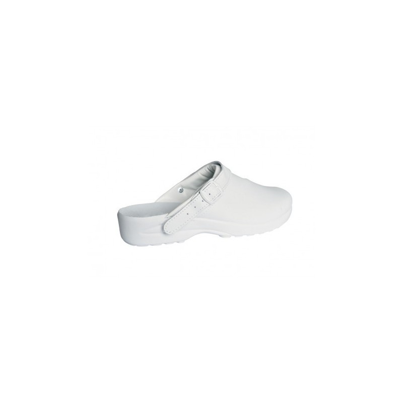 Tige cuir, blanche avec bride de maintien réglable et rabattable sur le coup de pied