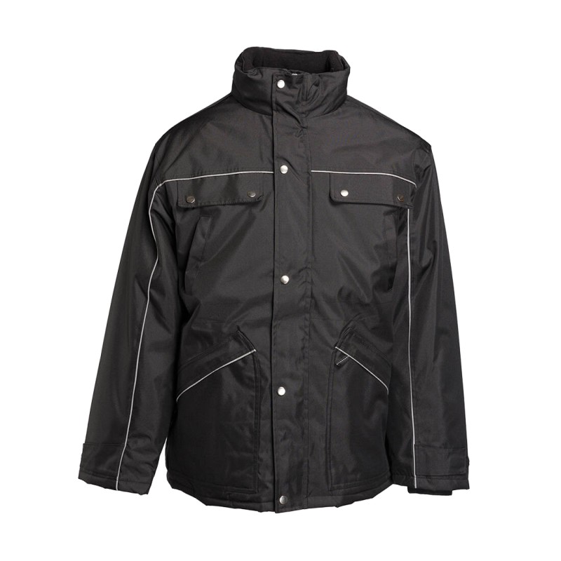 Veste de travail 3 en 1. Coupe-vent et imperméable. Passepoil réfléchissant sur le devant et le dos des manches. Capuche passe-montagne dans le col.