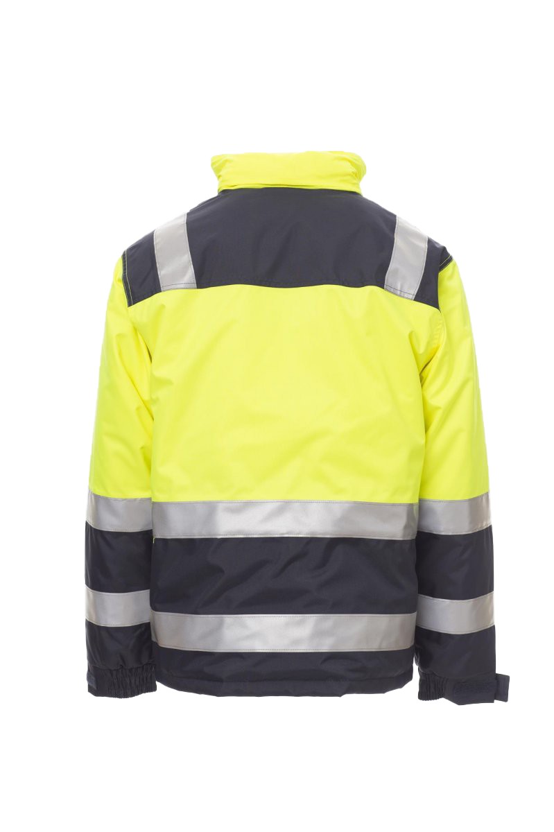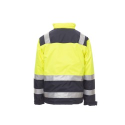 Veste pour homme bicolore haute visibilité avec bandes rétroréfléchissantes, ouverture par zip en plastique doté d’un curseur en métal et couvert par un rabat à velcro, capuche escamotable, manches montées, poignets élastiques réglables, deux poches frontales couvertes avec zip, une poche poitrine avec porte-badge couvert avec rabat et velcro. Intérieur rembourré non détachable, avec col et épaules en fibre polaire, une poche intérieure. Coutures thermoscellées.