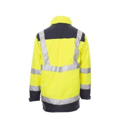 Parka bicolore 4 en 1 haute visibilité à bandes réfléchissantes. Veste extérieure sans doublure, ouverture par zip en plastique doté d'un curseur en métal et couvert par un rabat à velcro, capuche avec coulisse détachable et/ou pliable dans le col, poignets élastiques réglables. 4 poches frontales : poche poitrine droite avec velcro, porte-stylos et porte-badge escamotable, poche côté cœur avec zip, 2 poches inférieures avec zip et bouton-pression et ouverture latérale. Coutures thermoscellées. Blouson intérieur rembourré avec manches détachables, zip en plastique avec curseur en métal, poignets élastiques. 4 poches frontales : poche poitrine gauche avec velcro, porte-stylos et porte-badge escamotable, poche côté cœur avec zip, 2 poches inférieures avec velcro. Sur les deux : col et épaules en micropolaire, zip pour faciliter les impressions et les broderies, deux bandes sur le torse, les épaules et les manches.