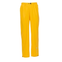 Pantalon anti-pluie, coulisse et élastique à la taille, bas des jambes réglable par bouton-pression, coutures thermosoudées.