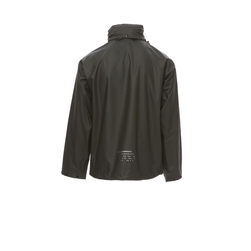 Veste anti-pluie à zip intégral couvert en plastique avec curseur en métal, capuche repliable dans le col, poignets réglables avec boutons-pression, coulisse au bas, deux poches enveloppe, coutures thermosoudées.