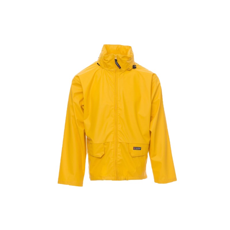 Veste anti-pluie à zip intégral couvert en plastique avec curseur en métal, capuche repliable dans le col, poignets réglables avec boutons-pression, coulisse au bas, deux poches enveloppe, coutures thermosoudées.
