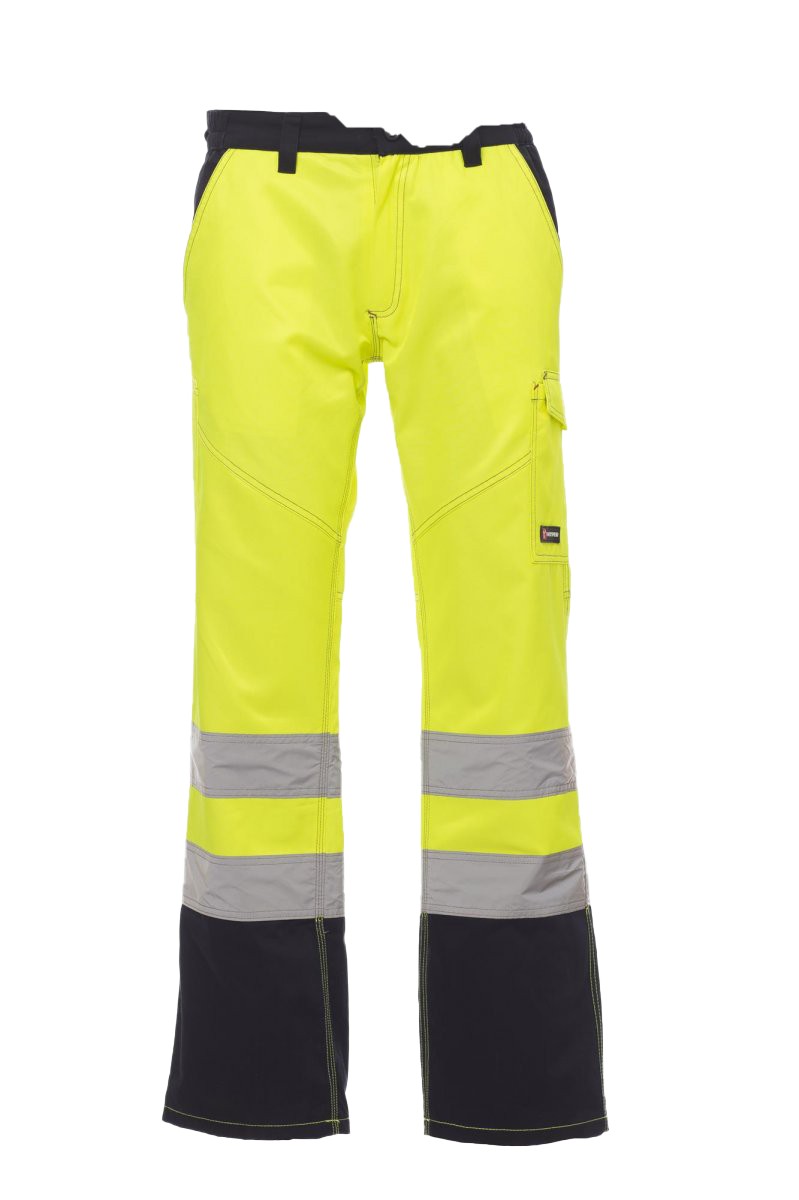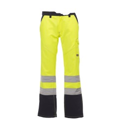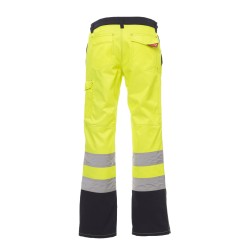 Pantalon homme d’hiver doublé en flanelle de coton (poids 150 g/m²), à haute visibilité bicolore avec bandes réfléchissantes, élastiques latéraux et passants à la taille, fermeture par zip et bouton en plastique, deux poches de coupe classique sur le devant, poche latérale LOCK SYSTEM, porte-mètre, deux poches arrière une ouverte et une avec rabat et velcro. Coutures en contraste, entrejambe et intérieur jambes à triple aiguille.