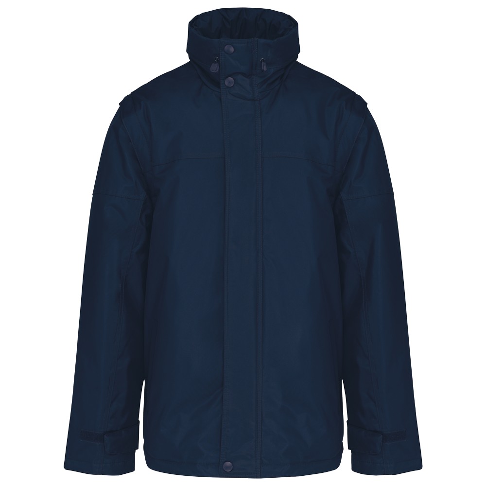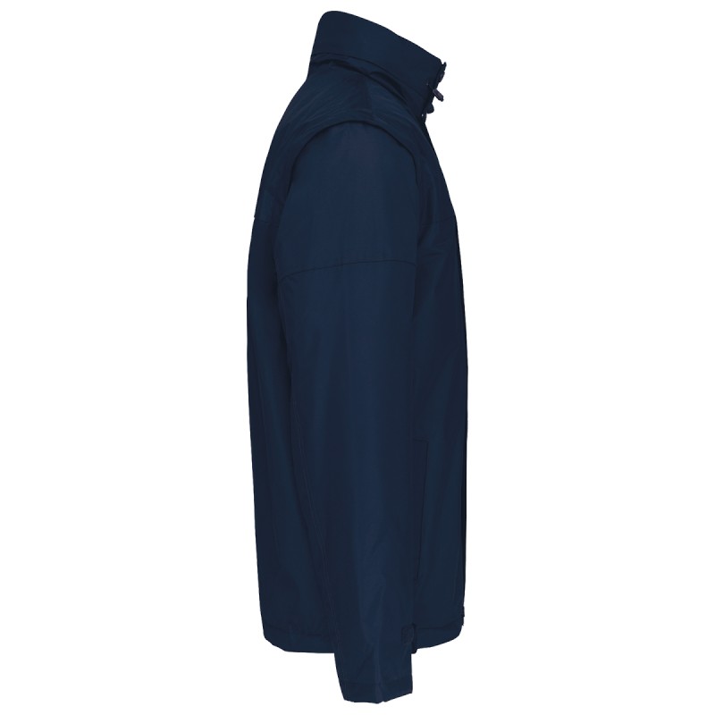 Extérieur : 100% polyester enduction PVC. Fermeture zippée et patte de boutonnage à pressions. Patte de serrage bas de manche auto-agrippante. Capuche sans col, fermeture zippée avec cordon élastique. 2 poches intérieures + 1 poche pour téléphone portable. Zip intérieur pour personnalisation. Doublure corps : 100% polyester et ouate 100% polyester. Manches amovibles. 2 poches latérales passepoilées.
