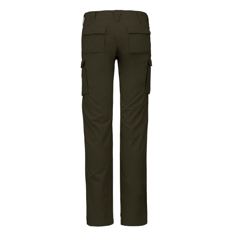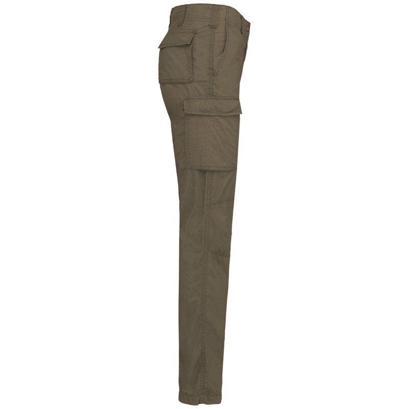 100% coton popeline. Tissu lavé pour un aspect souple et confortable. Intérieur ceinture contrasté avec cordon de serrage. Fermeture zippée et bouton pression. 2 poches italiennes devant. 2 poches à soufflet avec rabat et bouton pression à l'arrière et côtés. Empiècements genoux.