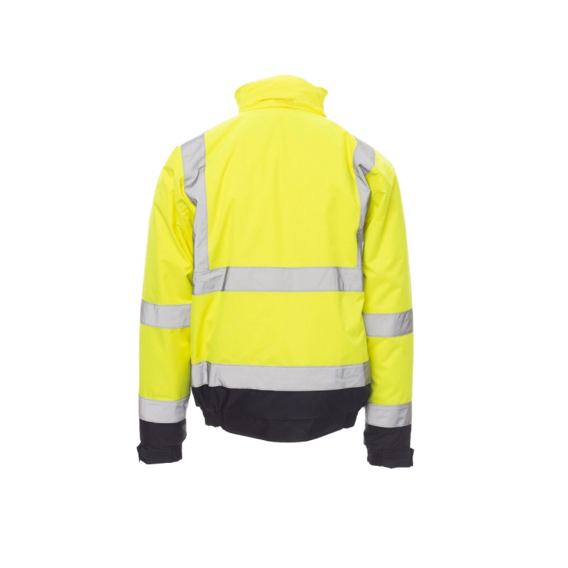 Blouson bicolore haute visibilité à bandes réfléchissantes, fermeture éclair intégrale avec rabat, capuche repliable dans le col, taille et poignets élastifiés, deux grandes poches frontales avec rabat et velcro, porte-téléphone portable et anneau de fixation pour porte-badge. Intérieur : rembourré, une poche avec velcro, coutures thermoscellées.