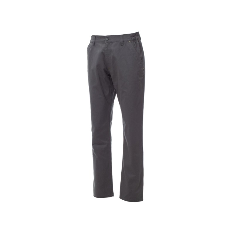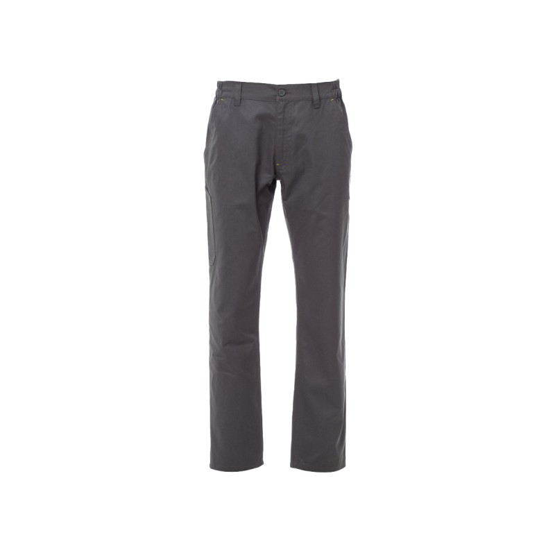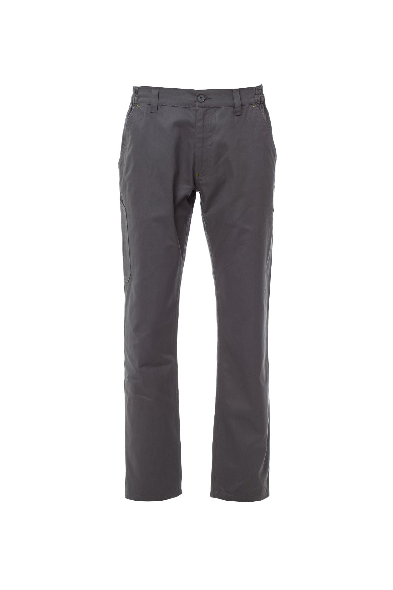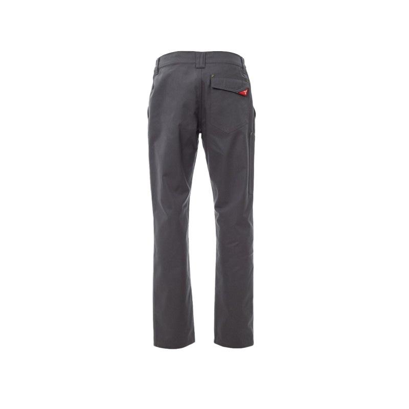 Pantalon avec passants et élastique à la taille, fermeture par zip et bouton. Deux poches de coupe classique sur le devant, porte-mètre latéral côté droit, une poche arrière avec rabat et velcro. Coutures triple piqûre.