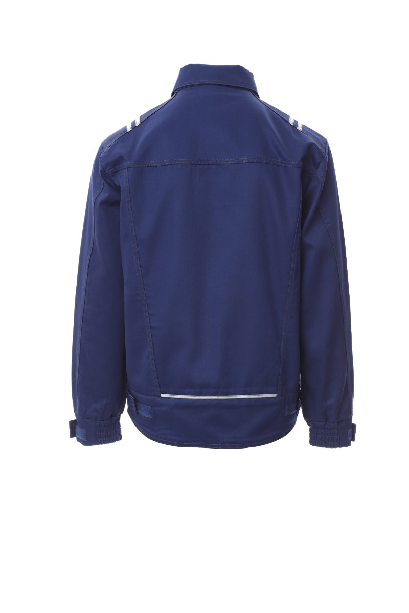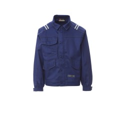 Blouson de type jeans en coton antistatique, antiacide, ignifuge, résistant aux arcs électriques et adapté aux soudeurs, doubles coutures en contraste, renforcées sur les manches, les côtés et le dos. Deux grandes poches à la taille et une petite poche sur la poitrine à droite avec porte-stylo, toutes couvertes par un rabat fermé par un velcro. Bas de dos profilé pour une meilleure couverture et réglable par velcro, manches montées avec poignet élastique doté d'attaches de brandebourg avec velcro pour réglage ultérieur. Zip avant couverte par un rabat à bouton-pression. Bandes 3M rétroréfléchissantes appliquées sur les épaules et le bas du dos. Porte-badge en plastique détachable.