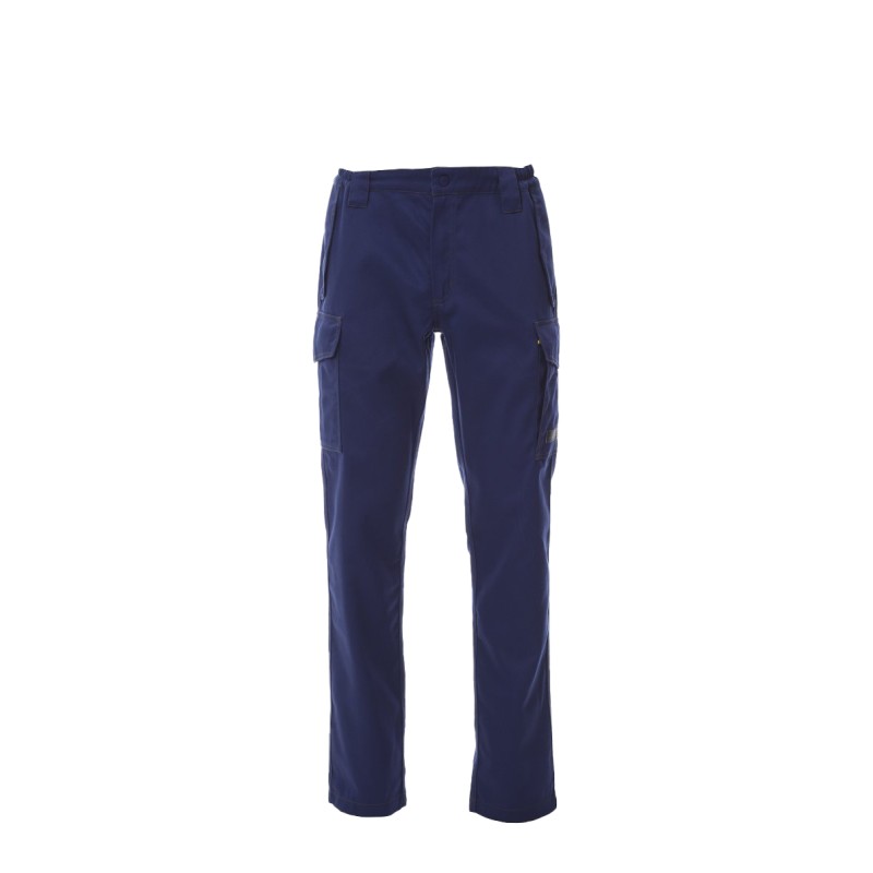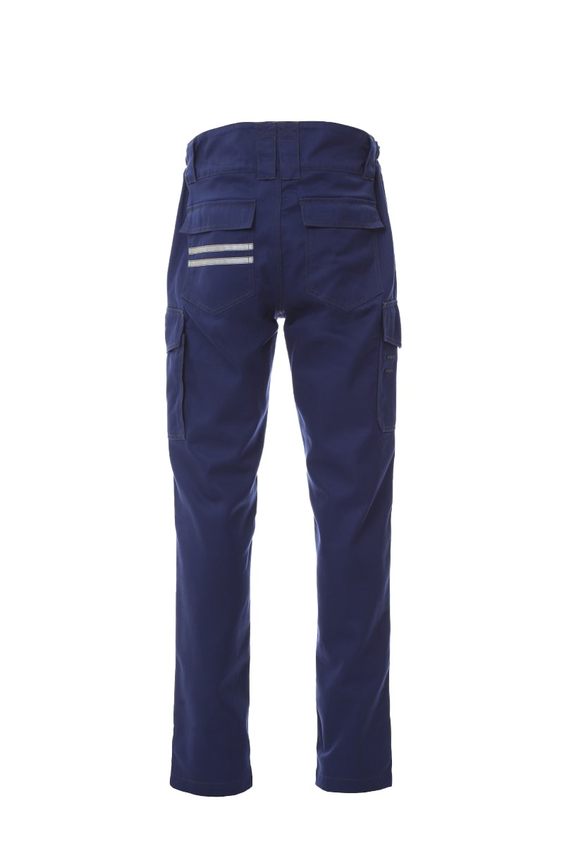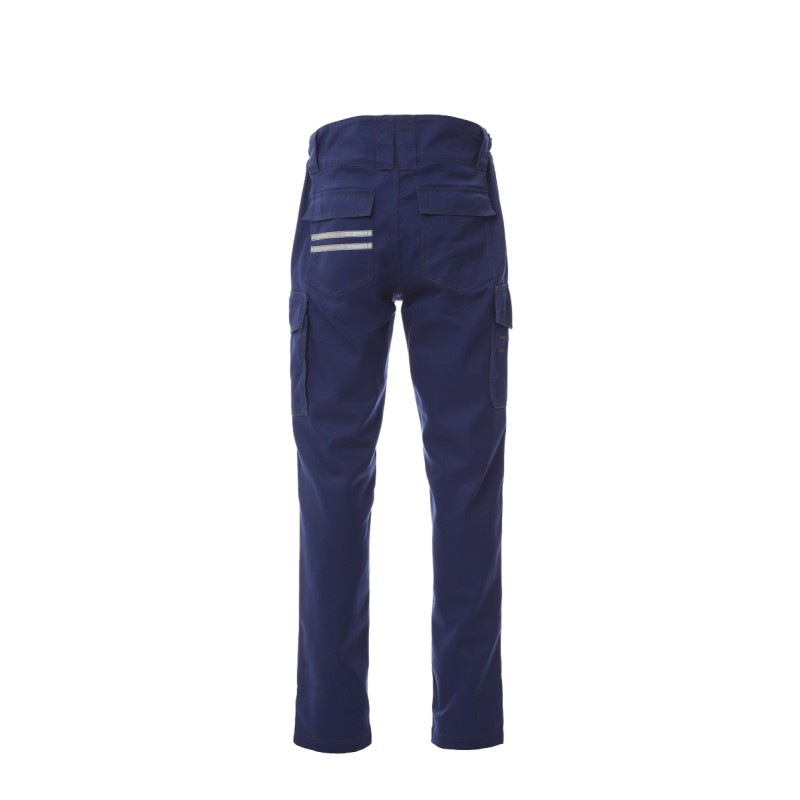 Pantalon en coton antistatique, antiacide, ignifuge, résistant aux arcs électriques et adapté aux soudeurs, ceinture profilée plus haute dans le dos pour une meilleure couverture avec élastiques latéraux et passepoilées à la taille, devant avec zip à bouton-pression. Doubles coutures en contraste renforcées sur l'entrejambe, l'extérieur et l'arrière de la jambe. Poches de coupe classique sur le devant, deux poches multifonction plus une poche à zip, deux poches arrière, toutes dotées d'un rabat de couverture à velcro. Bandes 3M rétroréfléchissantes appliquées sur la petite poche arrière